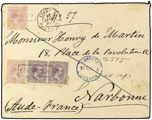 93(2),99(2) 1893 LINGAYEN a NARBONNE (Francia). 2 cts. violeta (2) y 10 ctvos rosa (2). Mat. lineal CERTIFICADO y fechador CORREOS/LINGAYEN. RARISIMA.