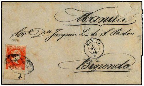 7 1863 (18-Dic.) MANILA a BINONDO. 5 cts. bermellón borde inferior de hoja, algunas erosiones de papel en la parte superior, sin importancia. ESPECTACULAR Y RARA.