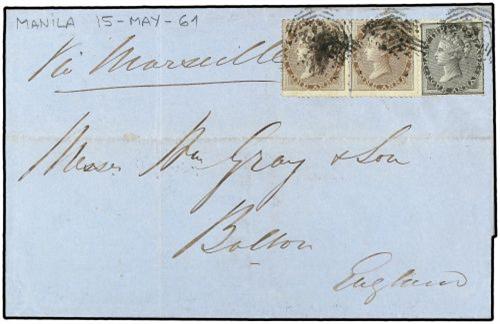 1861 (15 Mayo) MANILA a LONDRES. Circulada con sellos de India Inglesa de 1 anna castaño (2) y 4 annas negro matasellados en Singapur. Etiqueta comercial SMITH BELL/MANILA adherida al sobre. Muy raro uso de sellos de India en Filipinas.