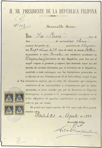 1793-1900 PAPEL SELLADO Y FISCALES. Conjunto de 8 documentos fiscales con papel sellado,varios con habilitaciones de la Republica Filipina y del Gobierno Revolucionario de 25 ctvos. y 2 pesos. Dos de los Documentos Fiscales llevan sellos de 50 ctvos. de Telégrafos del Gobierno Revolucionario. Importante conjunto que necesita un detenido examen.