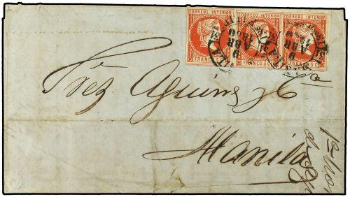 7(3) 1860 TAAL a MANILA. 5 ctvos. bermellón tira de tres. Magnífico y muy raro franqueo de triple porte. Cert. COMEX.