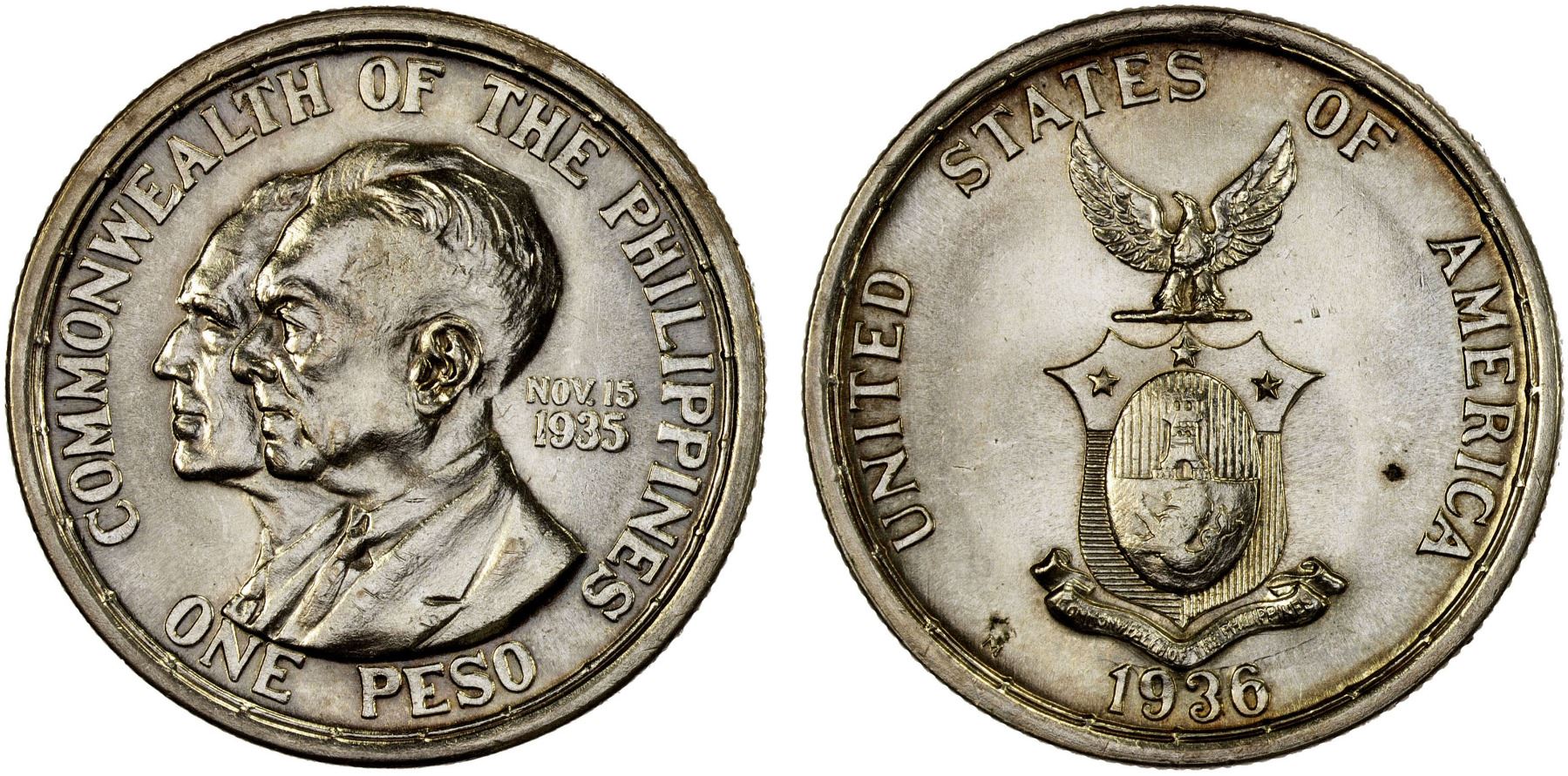 PHILIPPINES: U.S. Territory, AR peso, 1936-M, KM-178, Establishment of the Commonwealth-Murphy and Quezon, small reverse field spot, a few hairlines, mintage of only 10,000 pieces, Unc, ex Almer H. Orr III Collection.