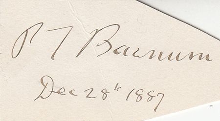 (1810-1891) An American showman, businessman, scam artist and entertainer, remembered for promoting celebrated hoaxes and for founding the circus that became the Ringling Bros. and Barnum & Bailey Circus. Cut signature "P.T. Barnum Dec. 28 1887" on a 2 1/2" x 1 1/2" white irregularly-cut slip. Also includes is a photogravure Rockwood Photo, 6 1/2" x 8 1/2", a contemporary Royal Bengals cigar card, 2" x 3 1/4", and a cabinet photo of Barnum by Eisenmann bearing a printed signature. Four pieces.