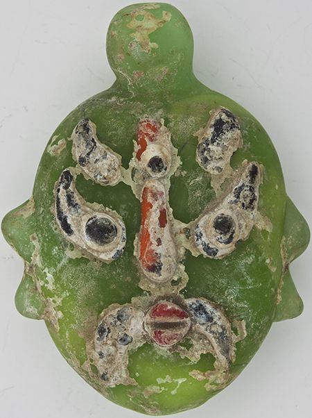Superb green glass Phoenician "good luck" pendant, 1 1/2" x 2 1/2", facial features of other colors of glass, ca. 1,200-1,000 BC. This pendant was discovered by underwater archaeologist Sir Robert Marx in the vicinity of Tyre, Lebanon in 1973 during a UNESCO-sponsored expedition which located Phoenician, Greek, Roman and Byzantine shipwrecks. The pendant is accompanied by Marx's signed Certificate of authenticity. Very good.