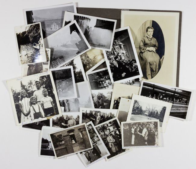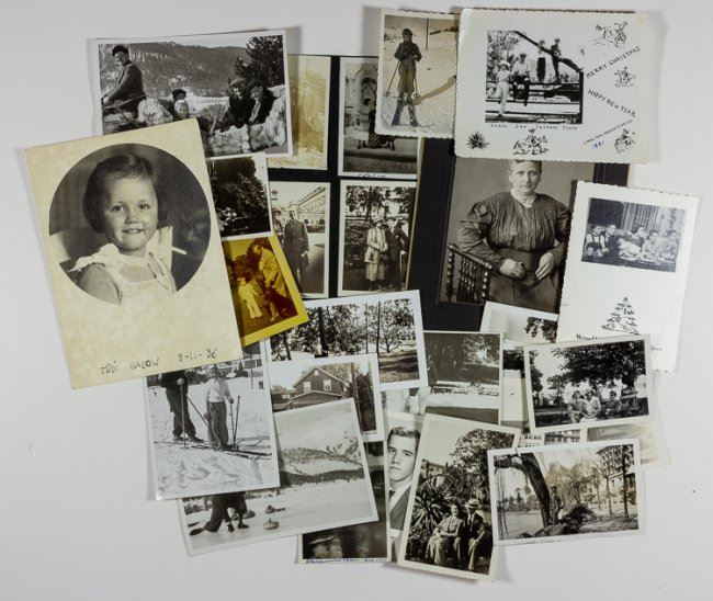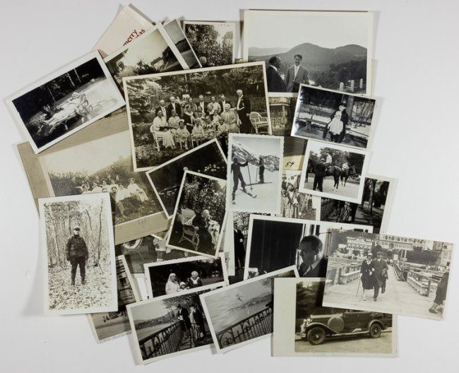 HERMANN SCHMITZ (1881-1960) German industrialist and Nazi war criminal. Schmitz served as CEO of the notorious industrial company I. G. Farben from 1935 to 1945. Collection of dozens of photographs of Schmitz and direct family members discovered in an estate in the U.S. Included are eleven photos of the war criminal from all stages of his life, including a carte de visite as a teenager, a casual photo from 1900, two images in uniform, five later poses, a family photo, a photo in his office, etc. Also present is the period typescript in English of a broadcast Schmitz made from Berlin on NBC radio on Dec. 2, 1931, issued by NBC radio, 8pp. 4to., in which Schmitz discusses the German debt to the Allied nations. Also present are a few photos each of his brothers OTTO SCHMITZ who was killed at Verdun, ALFRED SCHMITZ, also killed at Verdun, and WILHELM SCHMITZ, EMIL SCHMITZ, and DIEDRICH "DIETZ" SCHMITZ, from whose family these images apparently originated. About 150 additional photos are included, almost all family snapshots ranging from the Twenties to the Sixties, showing family matriarch Louisa, Diedrich, Hermann, and a variety of other relatives in such expensive locales as Rock Ridge in Greenwich, Ct. (possibly with fellow Nazis), Swiss ski areas, Bermuda, etc., and a 1933 bronze medallion, 5 ?" dia., honoring mother Louisa. Not surprisingly, none of the photos have any connection with any Nazis, swastika emblems, or any such World War II German association. Diedrich Schmitz was president of I.G. America, I.G. Farben's American branch which became General Aniline and Film and is alleged to have remained under Nazi influence. Hermann Schmitz came to I.G. Farben after having been employed at BASF. Prior to the war, Farben owned a large percentage of Standard Oil, as well as dozens of other international industrial firms, and Schmitz maintained excellent relations with them up until war broke out. In 1938, Schmitz was also named war economy administrator (Wehrwirtschaftsfhrer). At war's end, he was arrested and tried in the I. G. Farben war crimes trials for the use of slave labor and indirect murder of prisoners, though little mention was made of Farben's licensing of the manufacture of Zykon-B. Sentenced to four years, Schmitz later served as an administrator of Deutsche Bank and became honorary president of "Rheinische Stahlwerke AG". His enormous wealth, which he claimed was confiscated or otherwise lost, likely was distributed elsewhere.