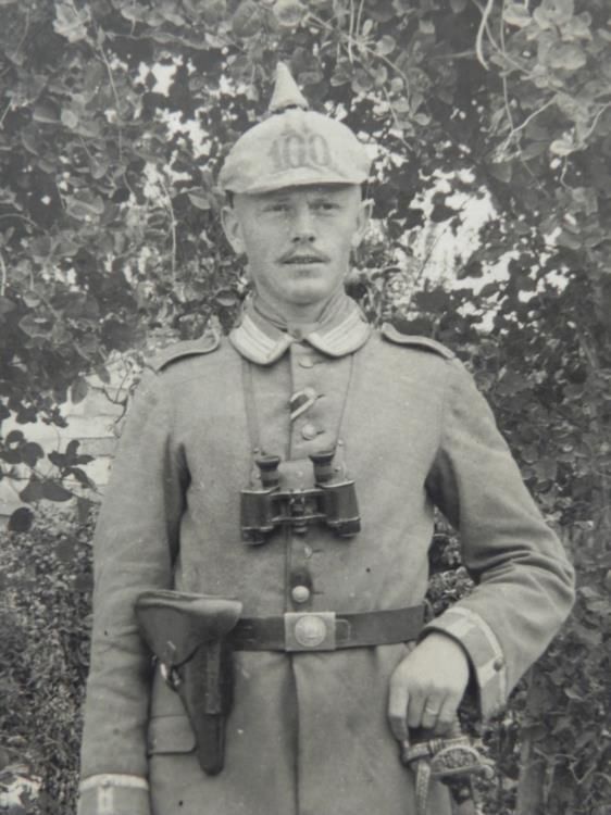 PHOTO OF GERMAN IMPERIAL SOLDIER IN FULL GEAR-ORIGINAL-DATED 1915 POSED IMPERIAL GERMAN WITH PICKELHAUBEN, BINOCULARS, SWORD AND LUGER-GREAT PHOTO-REVERSE MARKED WITH LOCATION AND DATED Sept 9, 1915