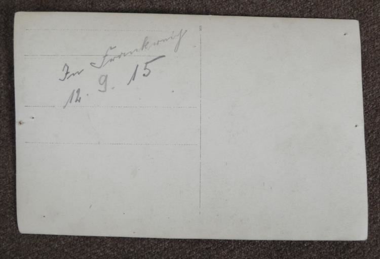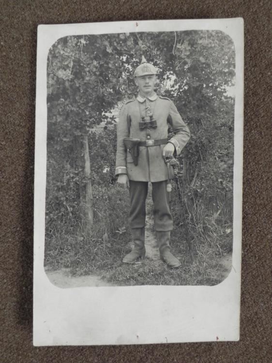 PHOTO OF GERMAN IMPERIAL SOLDIER IN FULL GEAR-ORIGINAL-DATED 1915 POSED IMPERIAL GERMAN WITH PICKELHAUBEN, BINOCULARS, SWORD AND LUGER-GREAT PHOTO-REVERSE MARKED WITH LOCATION AND DATED Sept 9, 1915