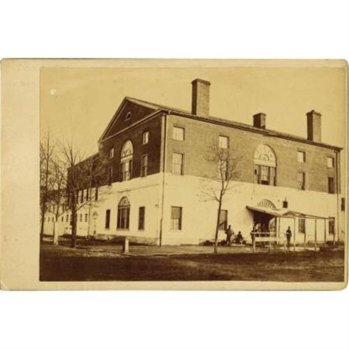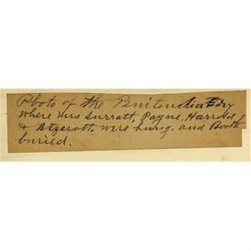 <B>PHOTO OF PENITENTIARY WHERE LINCOLN CONSPIRATORS WERE HUNG, CIRCA 1860S.</B></I> Eight conspirators were caught in the days after Lincoln's assassination and tried by a military court. They were found guilty on June 30th and given various sentences depending upon their involvement. Lewis Powell (Paine), David Herold, George Atzerodt, and Mary Surratt were charged with conspiring with Booth, along with various other crimes, and hanged on July 7, 1865. <BR><BR>This sepia photograph of the<B> </B></I>Old Arsenal Penitentiary, Washington D. C. (Fort Lesley J. McNair today), has paper tag on verso in period ink: <I>“Photo of the Penitentiary where Mrs. Surratt, Payne, Harrold</B></I> sic (Herold), & Atzerott sic <I>Atzerodt were hung and Booth buried”</B></I>.<BR><BR><B>Provenance: </B></I><I>Al. Emmett Fostell Collection</B></I><B><I> </B></I></B></I><BR><BR><B>Condition:</B></I> Has pencil erasing at top left corner card and on image, fine condition.<BR><BR><b>Shipping:</b> Miscellaneous Collectibles, Smal (<a target="_blank" href="http://www.heritageauctions.com/common/shipping.php">view shipping information</a>)