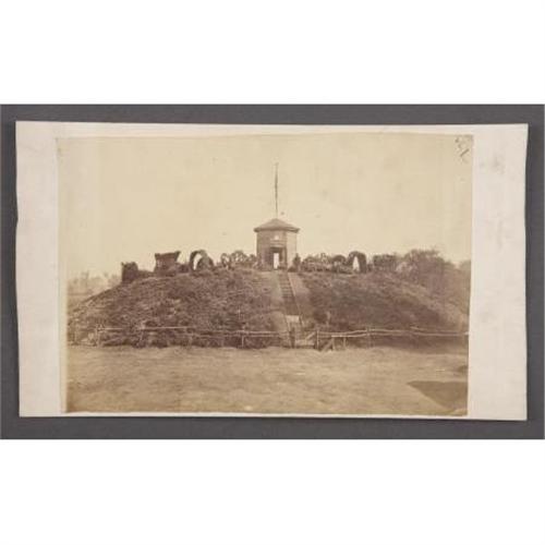 <B>PHOTOGRAPH MEN POSED ON THE CITICO MOUND 1865.</B></I> This early albumen photograph of Citico Mound, Tennessee very strategic position for Confederates during the Civil War. Sign reads: “Visitors are required to register their names at office”. 8.25” x 5.75”. <BR><BR><B>Condition:</B></I> Fine, has some soiling.<BR><BR><b>Shipping:</b> Flat Material, Small (<a target="_blank" href="http://www.heritageauctions.com/common/shipping.php">view shipping information</a>)
