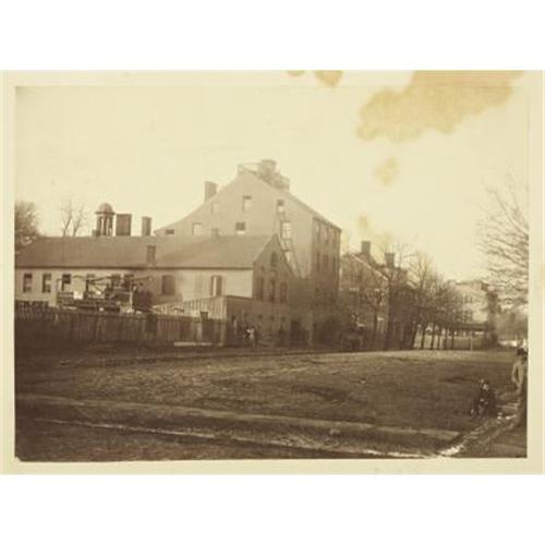 <B>PHOTOGRAPH MILITARY HOSPITAL ALEXANDRIA, VIRGINIA 1863.</B></I> This is an early Civil War albumen print done by photographer A. J. Russell of the Military Hospital on Washington Street in Alexandria, Virginia. 9.25” x 6.75” mounted on card 12.75” x 9”. <BR><BR><B>Condition:</B></I> Good, nice contrast, but has stains.<BR><BR><b>Shipping:</b> Flat Material, Small (<a target="_blank" href="http://www.heritageauctions.com/common/shipping.php">view shipping information</a>)