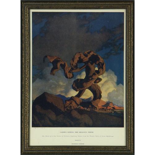 COLOR PHOTOLITHOGRAPH 12 3/4 x 10 3/4''. Maxfield Parrish (1870-1966), NH. ''Cadmus Sowing the Dragons Teeth'' from the ''Wonder Tales of Greek Mythology''. Placed in a period frame.