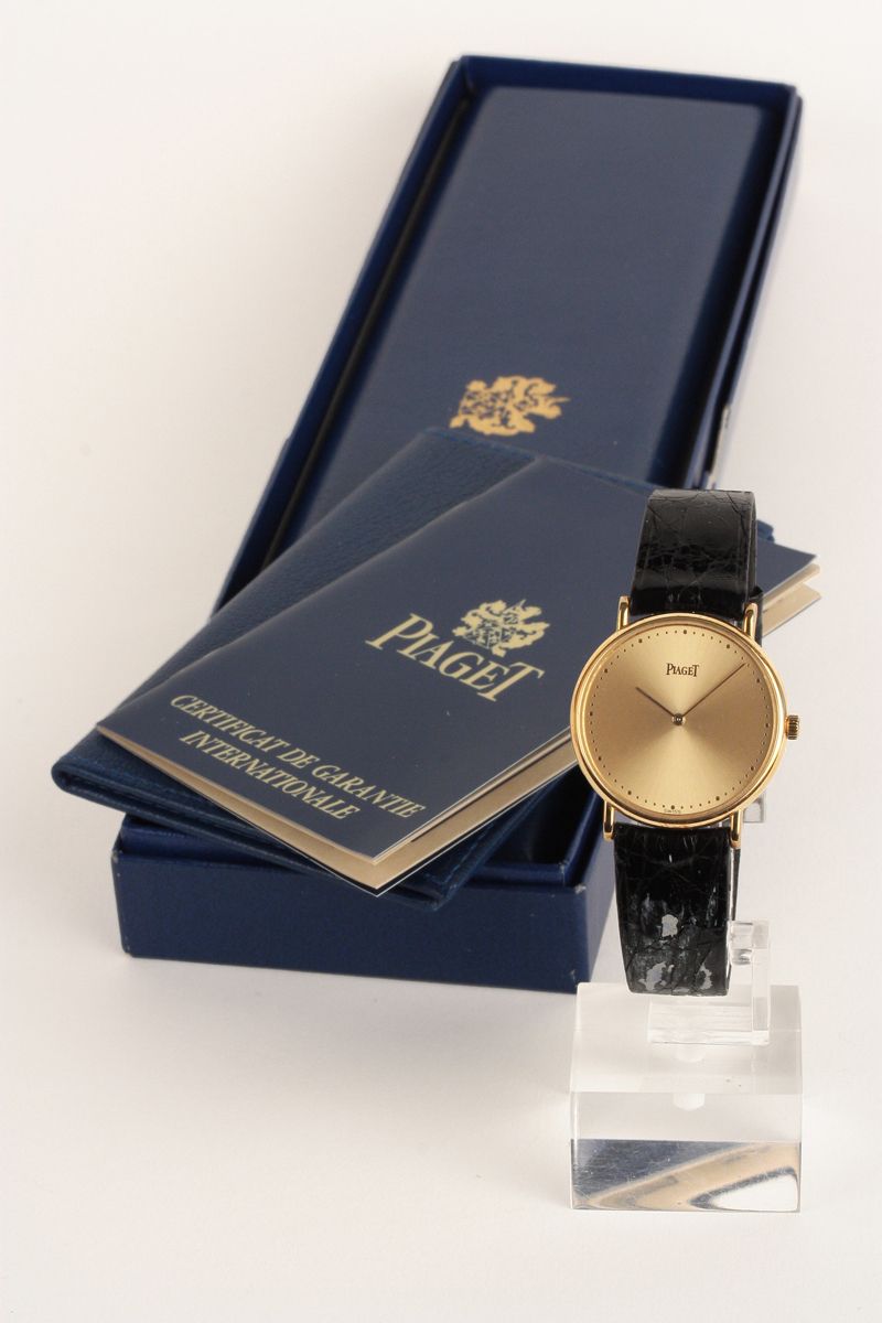 PIAGET, 1993. Round case in 18k yellow gold, diam. 30 mm, ref. GOA04159, n. 9025N 564 293 (very good condition). Gilt dial with applied indexes, (very good condition, original). Round movement with manual winding (very good condition). With box and warranty. With original leather strap and original buckle in 18K yellow gold. Dial, case and movement signed.