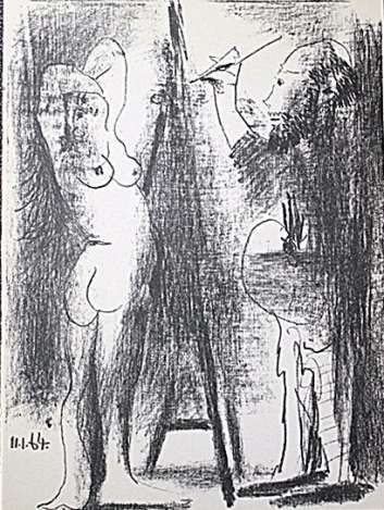 PABLO PICASSO ORIGINAL LITHOGRAPH - ""LE PEINTRE ET SON MODELE" (THE ARTIST AND HIS MODEL II) - ON VELIN D' ARCHES WOVE PAPER - PRINTED IN 1964 BY THE LEGENDARY ATELIER FERNAND MOURLOT, MOURLOT FRERES, PARIS FRANCE - ISSUED IN A LIMITED EDITION OF 2000 - CATALOG REFERENCE: MOURLOT 400 - DATE SIGNED IN THE PLATE (NOT BY HAND) - SHEET SIZE: 10" X 7 1/2" (255 X 185 MM) - PROFESSIONALLY FRAMED AND MATTED - THIS PICASSO ORIGINAL LITHOGRAPH IS FROM THE SCARCE AND LAVISHLY-PRODUCED LIMITED EDITION CATALOGUE, "PRINTS FROM THE MOURLOT PRESS". PUBLISHED IN 1964 BY MOURLOT ON THE OCCASION OF THEIR LANDMARK TRAVELING EXHIBITION, WHICH WAS SPONSORED BY THE FRENCH EMBASSY AND THE SMITHSONIAN - THE CATALOG WAS LIMITED TO 2000 COPIES ON VELIN DE ARCHES WOVE PAPER AND 200 COPIES ON VELIN DE RIVES PAPER WHICH WERE RESERVED FOR THE ARTISTS