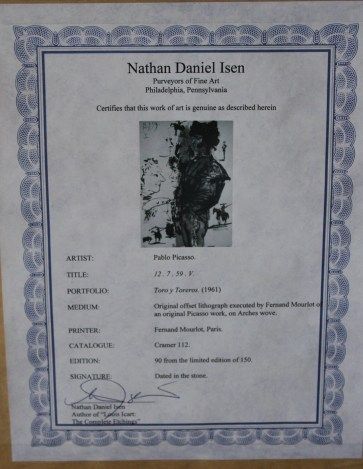 PABLO PICASSO ORIGINAL LITHOGRAPH FROM THE PORTFOLIO "TORO Y TOREROS" - 1961 - PRINTED IN PARIS BY FERNAND MERLOT ON ARCHES WOVE PAPER IN A LIMITED EDITION OF 150 - CATALOGUE REFERENCE CRAMER 112 - NUMBERED IN PENCIL - DATED IN THE STONE - COMES WITH CERTIFICATE OF AUTHENTICITY - PROFESSIONALLY FRAMED & MATTED - IMAGE SIZE APPX 14.5" X 10.5" - FRAMED SIZE APPX 29.5" X 26"