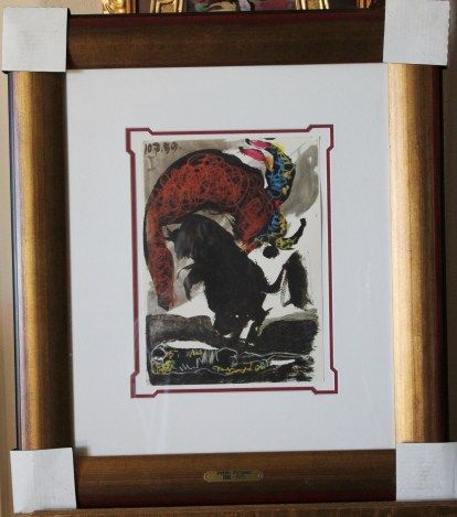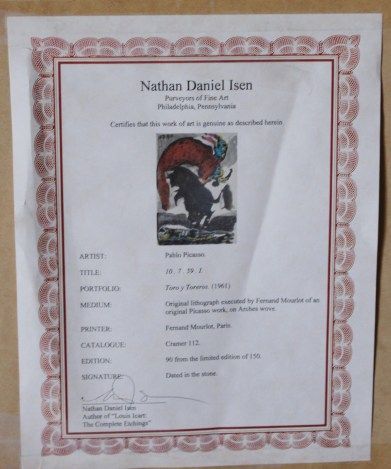 PABLO PICASSO ORIGINAL LITHOGRAPH FROM THE PORTFOLIO "TORO Y TOREROS" - 1961 - PRINTED IN PARIS BY FERNAND MERLOT ON ARCHES WOVE PAPER IN A LIMITED EDITION OF 150 - CATALOGUE REFERENCE CRAMER 112 - NUMBERED IN PENCIL - DATED IN THE STONE - COMES WITH CERTIFICATE OF AUTHENTICITY - PROFESSIONALLY FRAMED & MATTED - IMAGE SIZE APPX 14.5" X 10.5" - FRAMED SIZE APPX 29.5" X 26"