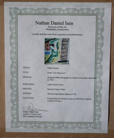 PABLO PICASSO ORIGINAL LITHOGRAPH FROM THE PORTFOLIO "LES DEJEUNERS" - 1962 - PUBLISHED IN PARIS BY ANDRE SAURET - PRINTED IN PARIS BY MOURLOT FRERES ON ARCHES WOVE PAPER IN A LIMITED EDITION OF 150 - CATALOGUE REFERENCE CRAMER 112 - NUMBERED IN PENCIL - COMES WITH CERTIFICATE OF AUTHENTICITY - PROFESSIONALLY FRAMED & MATTED - IMAGE SIZE APPX 14.5" X 10.5" - FRAMED SIZE APPX 29.5" X 26"