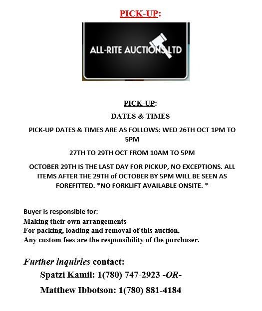 14. Arranged shipping are available and are made by All-Rite Auctions LTD. Shipping prices will be disclosed in your invoice. Alternatively, the bidder does have the option of picking up the lot(s) won from the sale site, within 48 hours.
