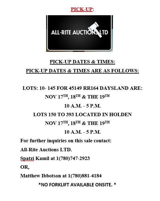 14. Arranged shipping are available and are made by All-Rite Auctions LTD. Shipping prices will be disclosed in your invoice. Alternatively, the bidder does have the option of picking up the lot(s) won from the sale site, within 48 hours.