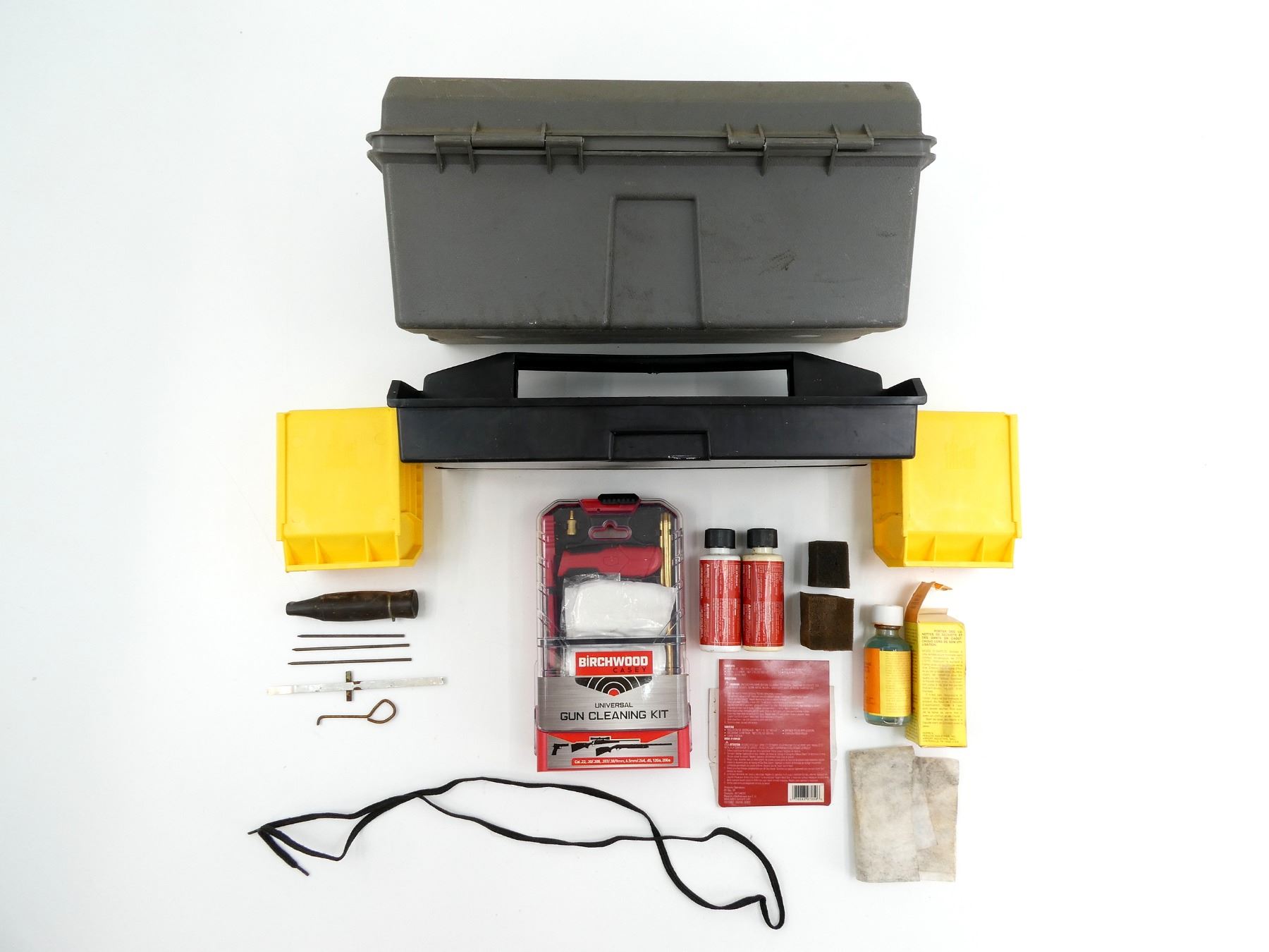 LOT INCLUDES; (1) OUTERS CLEANING KIT WITH GUN BLUE, METAL CLEANER, SPONGES, ETC., (1) HOPPE'S GUN BLUE WITH ORIGINAL PACKAGING, (1) BIRCHWOOD CASEY UNIVERSAL GUN CLEANING KIT, FITS VARIOUS CALIBERS, WITH 5-PIECE BRASS CLEANING ROD, 7-PIECE BORE BRUSHES, 5-PIECE BRASS JAGS, 2-PIECE MOP BRUSH, PATCHES, ETC., (1) PERFECT MALLARD DUCK CALL, VARIOUS MARKINGS, (1) GREY PLASTIC TOOL / TACKLE BOX, REMOVEABLE TRAY, APPROX. 16" X 8" X 7.25", ETC. SEE PHOTOS. ** PICK UP ONLY **