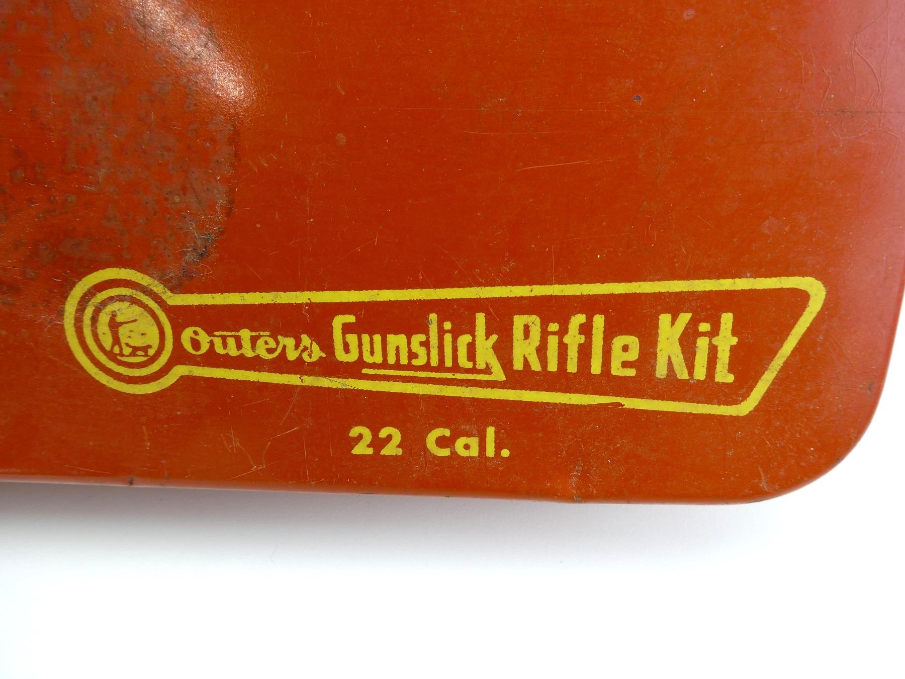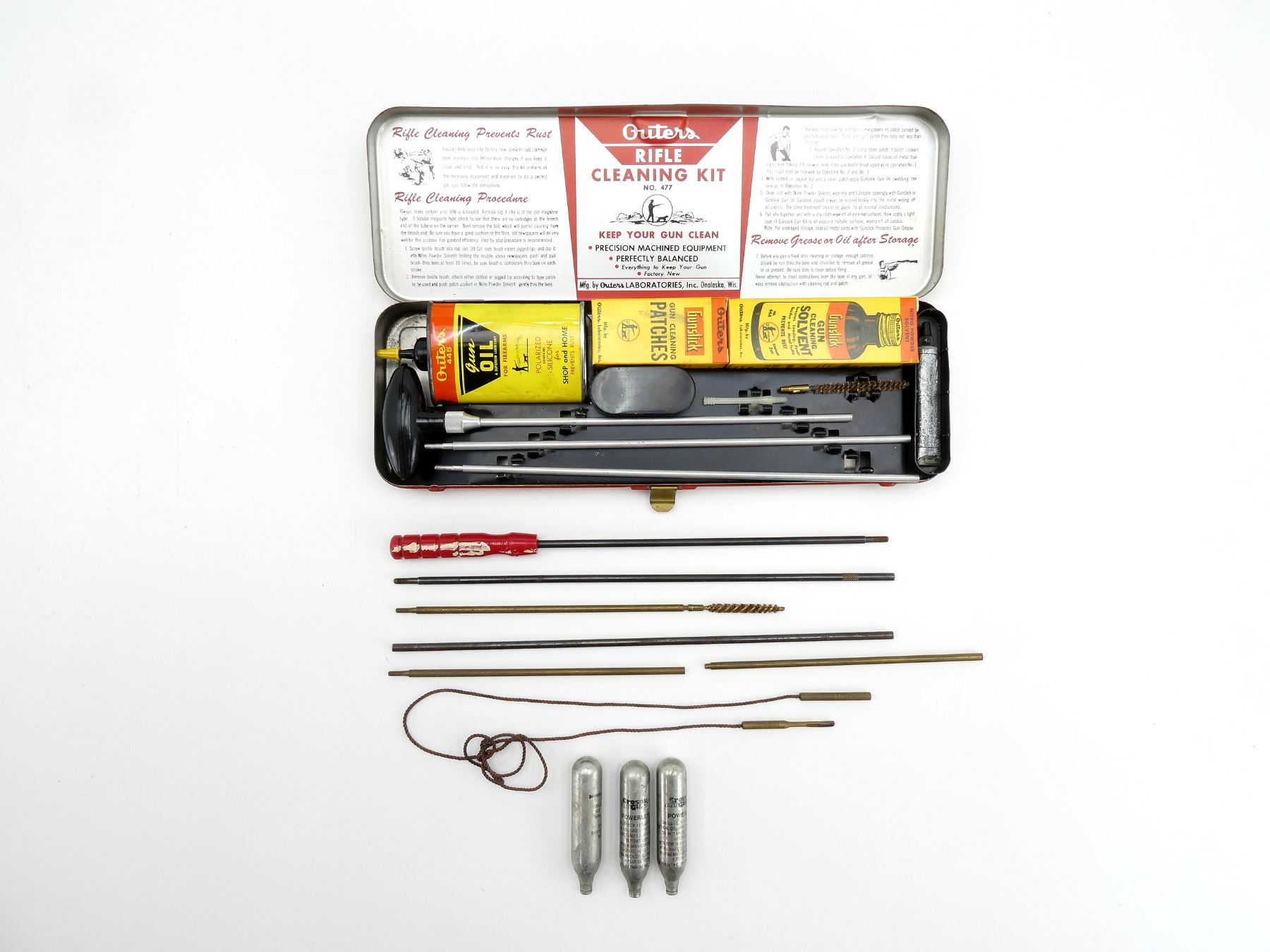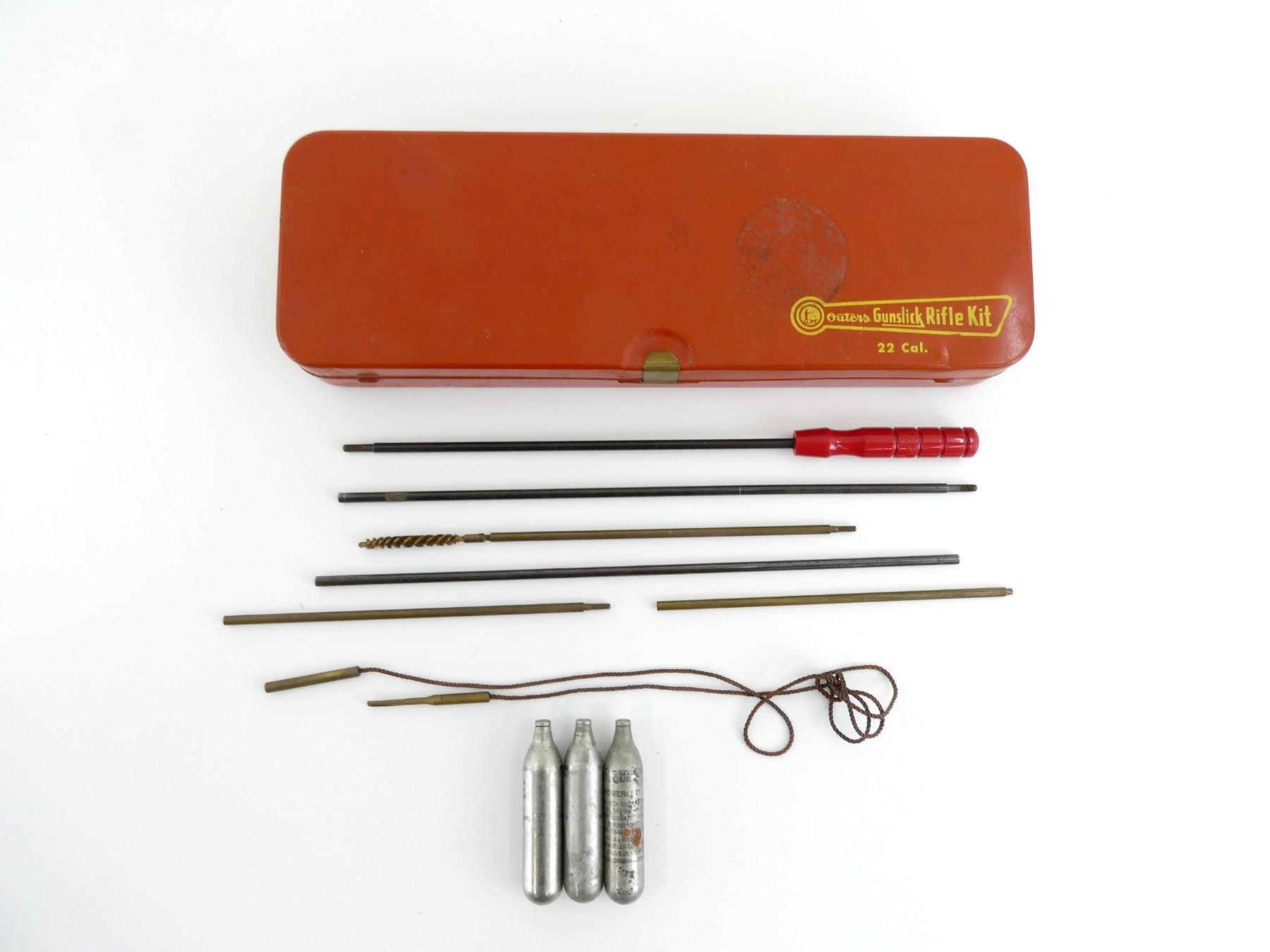 LOT INCLUDES; (1) OUTERS GUNSLICK .22 CAL. RIFLE CLEANING KIT WITH PATCHES, GUN CLEANING SOLVENT, GUN OIL, 3-PIECE CLEANING ROD, WIRE BRUSH, ETC., (2) 3-PIECE CLEANING RODS, BRASS / METAL CONSTRUCTION, ONE WITH HANDLE, ONE WITHOUT, OALS APPROX. 22.75" & 35 5/8", (3) CROSMAN CO2 POWERLETS, 12 GRAM CARTRIDGES & (1) ROPE PULL-THRU WITH BRASS WEIGHTS. SEE PHOTOS. ** PICK UP ONLY **