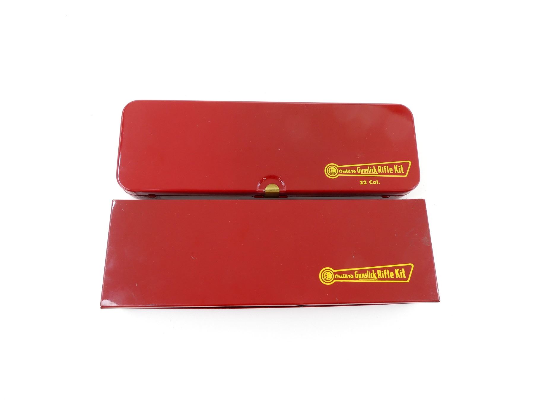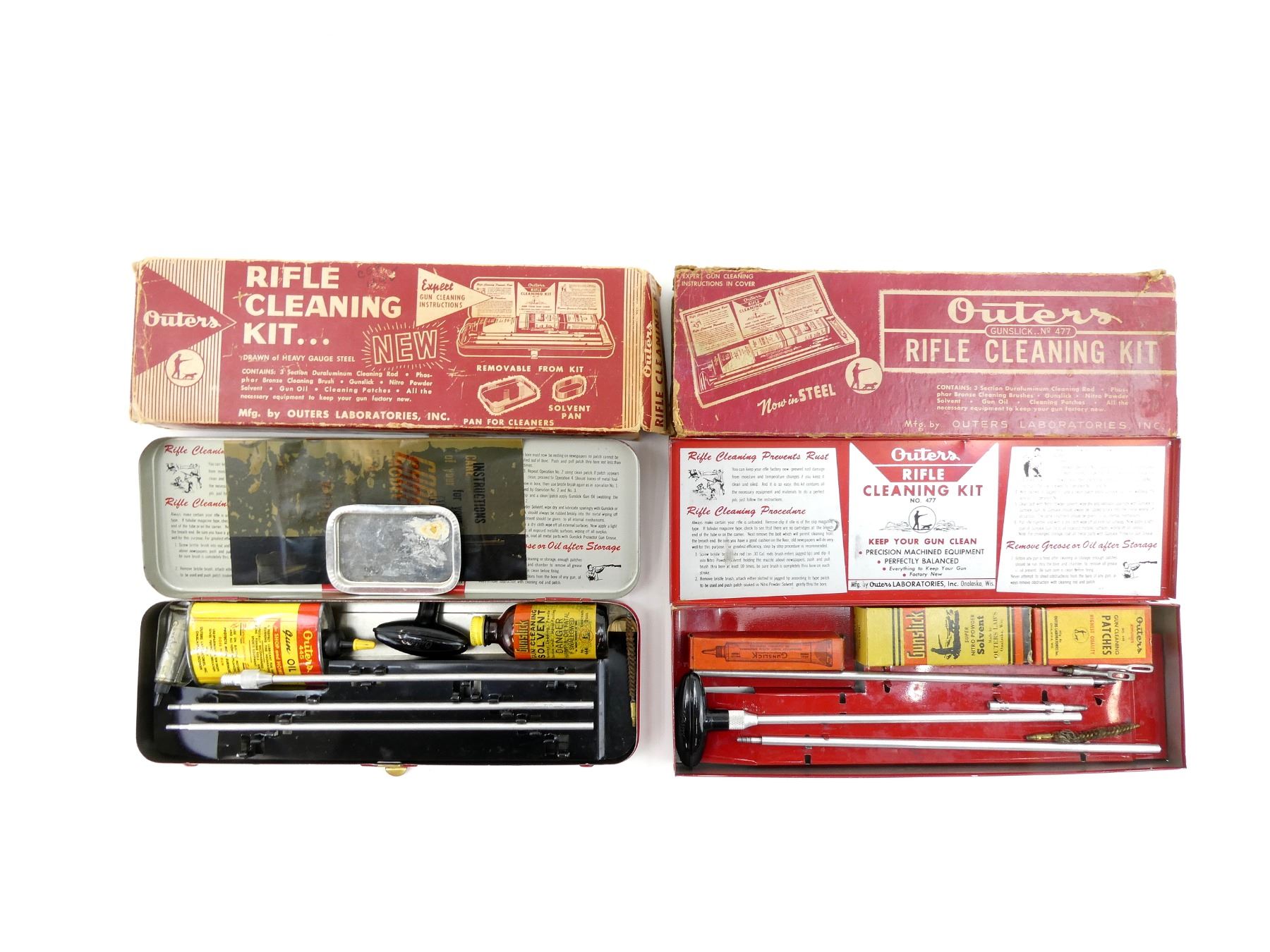 LOT INCLUDES; (2) OUTERS GUNSLICK RIFLE CLEANING KITS, INCLUDES; RODS, JAGS, BRUSHES, LUBRICANTS, ETC., SHOWS WEAR & TEAR / USE MARKINGS, MAY NOT BE COMPLETE / PIECES MAY BE MISSING. SEE PHOTOS.