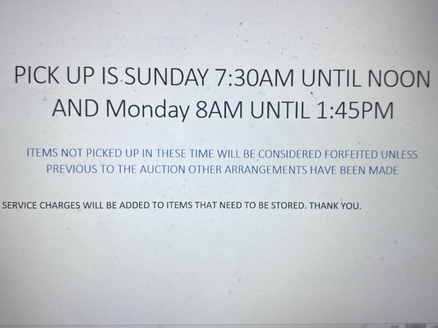 PICK UP OF ITEMS IS SUNDAY 7:30am until Noon and Monday 8am until 1:45pm