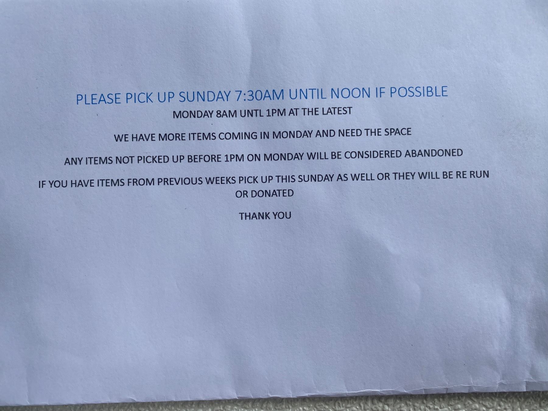 ITEMS NOT PICKED UP IN THESE TIME WILL BE CONSIDERED ABANDONED NO REFUNDS WILL BE GIVEN.