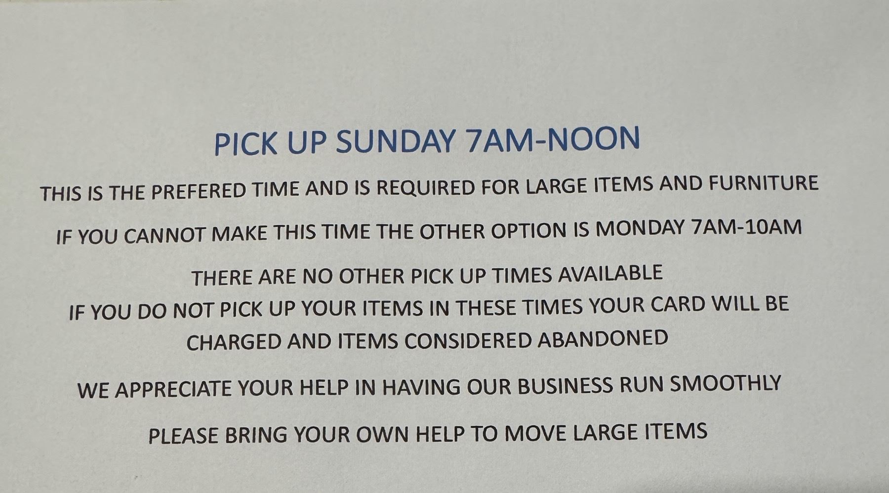 Pick up is Sunday 7AM-NOON Immediately Following the auction. Monday 7AM-10AM if needed. IF you so do not pick up these hours we will charge your credit card 10% handling fee. Items will be considered abandoned.