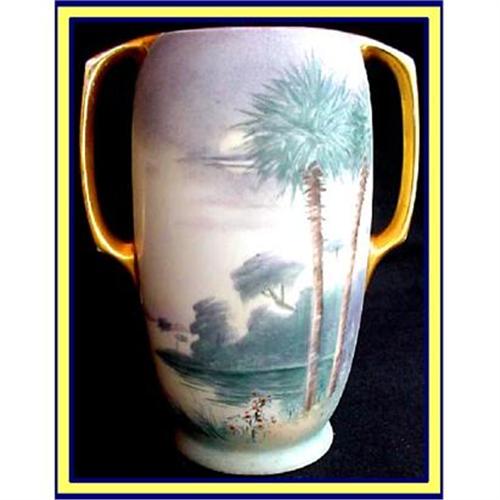 A Pickard hand painted, vase, early 20th century, Chicago. Signed by artist Eva Maley 1910-1912, 1912-18.<BR>Measures 7 1/4inches high.<BR>Cylindrical shape on a round foot. Two long gilded handles and gilded rim.<BR>Beautiful handpainted tropical waterscape with tall Palm trees above the water and a full moon behind the clouds. Soft greys, blues and greens. <BR>The vase is in excellent condition except for minor gilt wear on the rim and a superficial 1/2inch line on the back - visible only if you are really looking for it. <BR>Artist signed beneath the right handle Eva Maley, who did some sub-contracting work for Pickard and this scene is considered rare for her. <BR>Underneath is the Pickard mark Handpainted China Pickard on a gold leaf, used during the 1912-18 period.