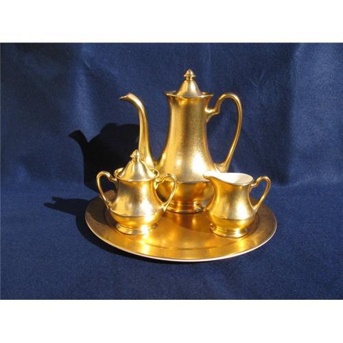 THIS IS A STUNNINGLY ELEGANT PICKARD ALL GOLD COFFEE SET THAT IS IN EXCELLENT CONDITION. FANTASTIC FOR A GIFT OR TO SERVE YOUR GUESTS AND ASTONISH THEM WITH ITS BEAUTY! THE POT MEASURES 8" HIGH (MARK 625) THE CHOP PLATE OR PLATTER 13" IN DIAMETER (MARK 475) THE CREAMER IS 3.5" HIGH AND THE SUGARBOWL WITH LID IS ALSO 3.5" HIGH (BOTH ARE MARK 626). THERE ARE NO CHIPS CRACKS HAIRLINES OR REPAIRS. ABSOLUTELY GORGEOUS!