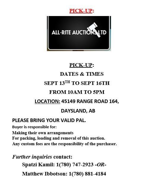 It is the purchaser's sole responsibility to make any necessary inquiries and to inspect the item before placing a bid. Viewing is available by appointment, please contact All-Rite Auctions at 1-780-747-2923 or 1-780-881-4184.