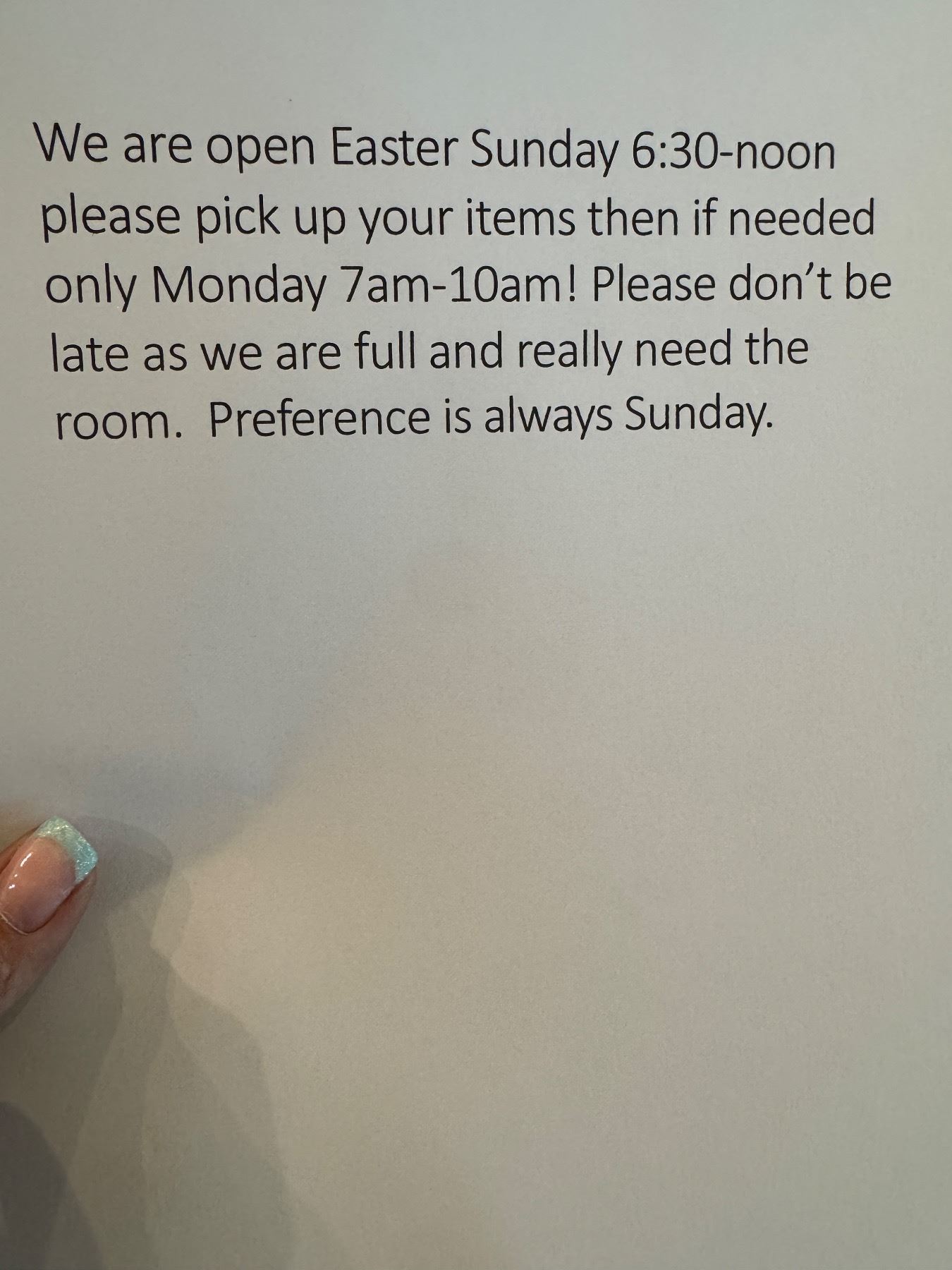 Pick up is Sunday 7AM-NOON Immediately Following the auction. Monday 7AM-10AM if needed. IF you so do not pick up these hours we will charge your credit card 10% handling fee. Items will be considered abandoned.