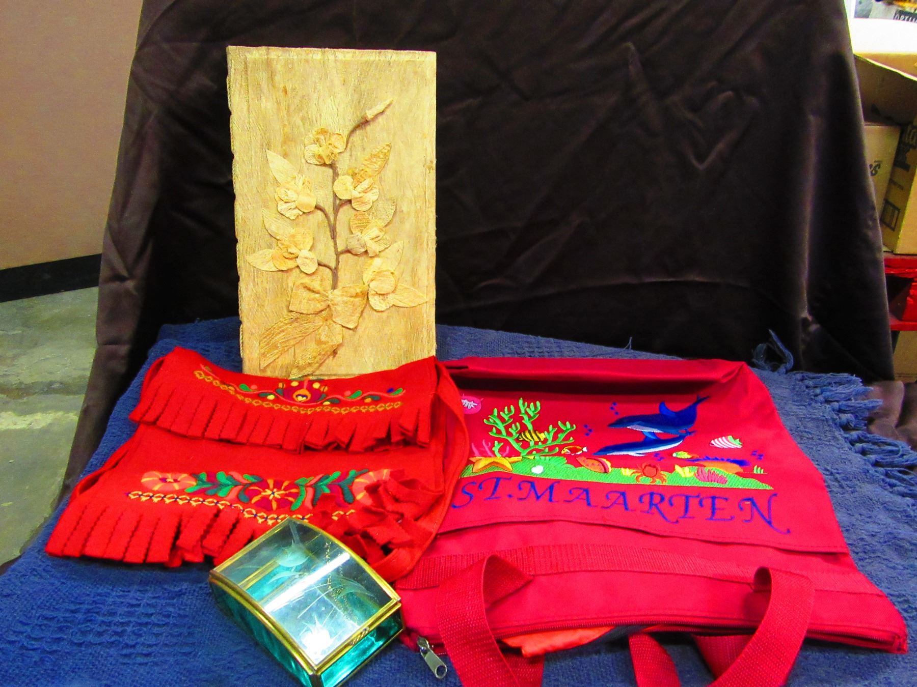 PICTURE, JEWELRY BOX & 2 CARRY BAGS