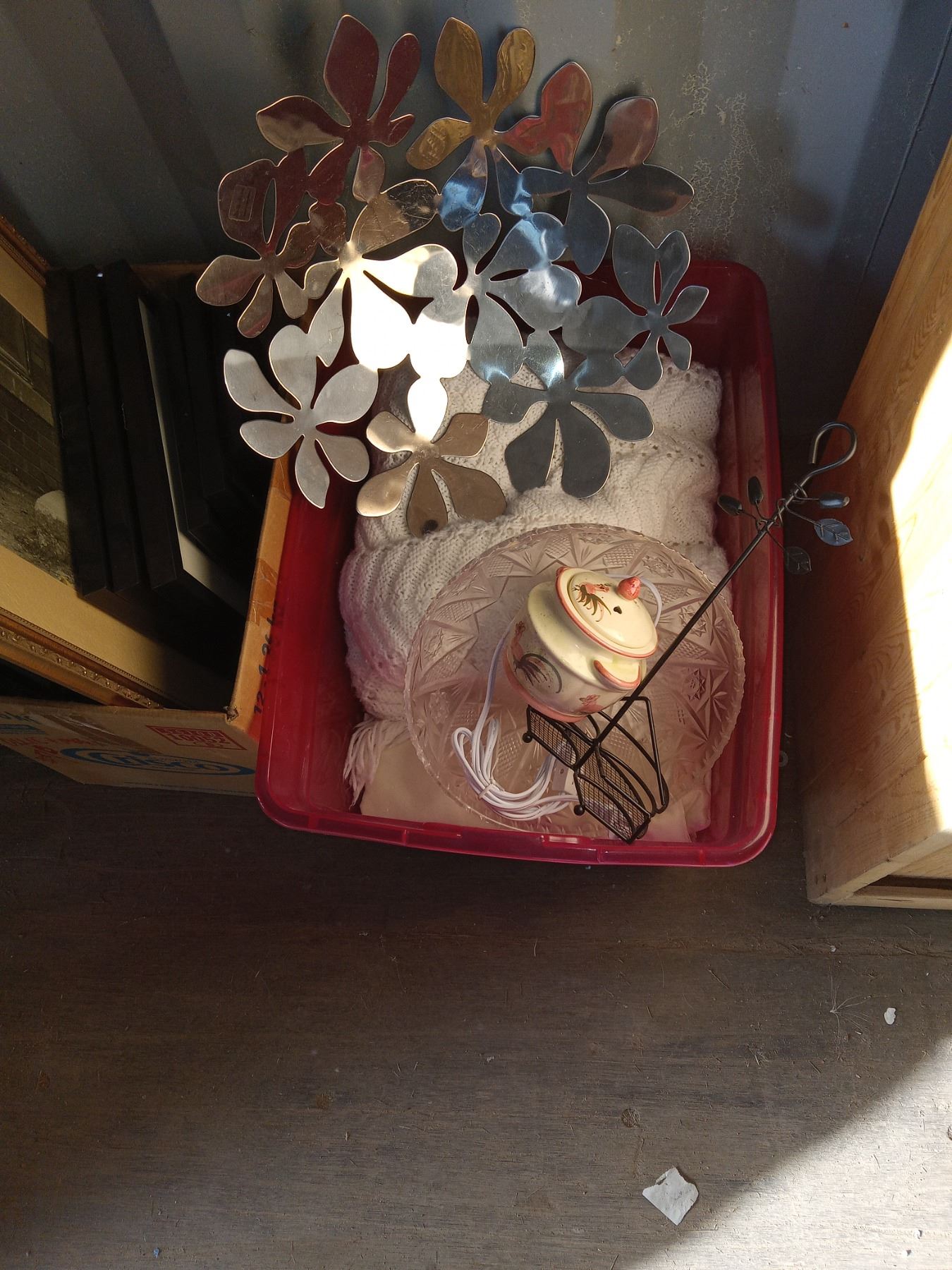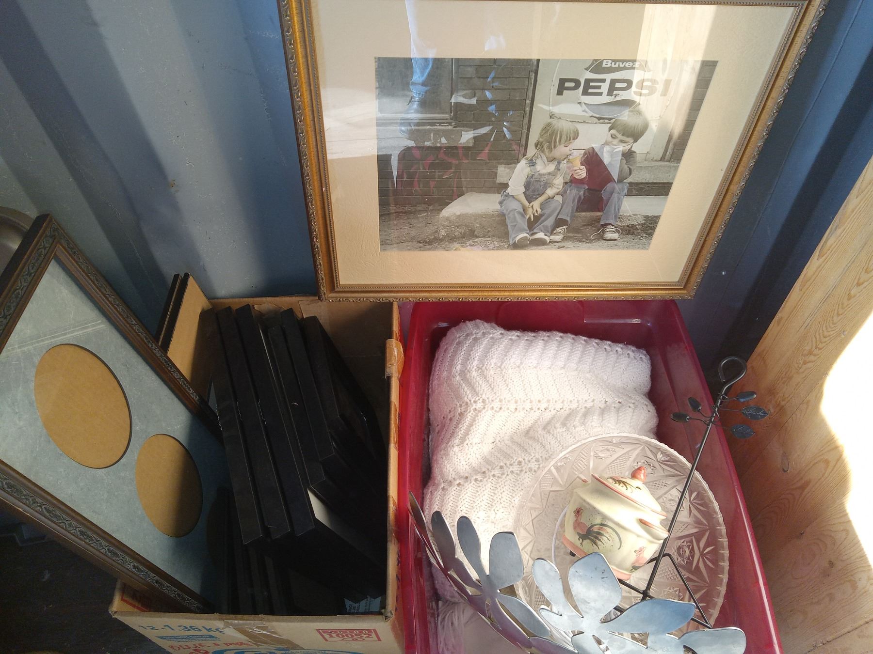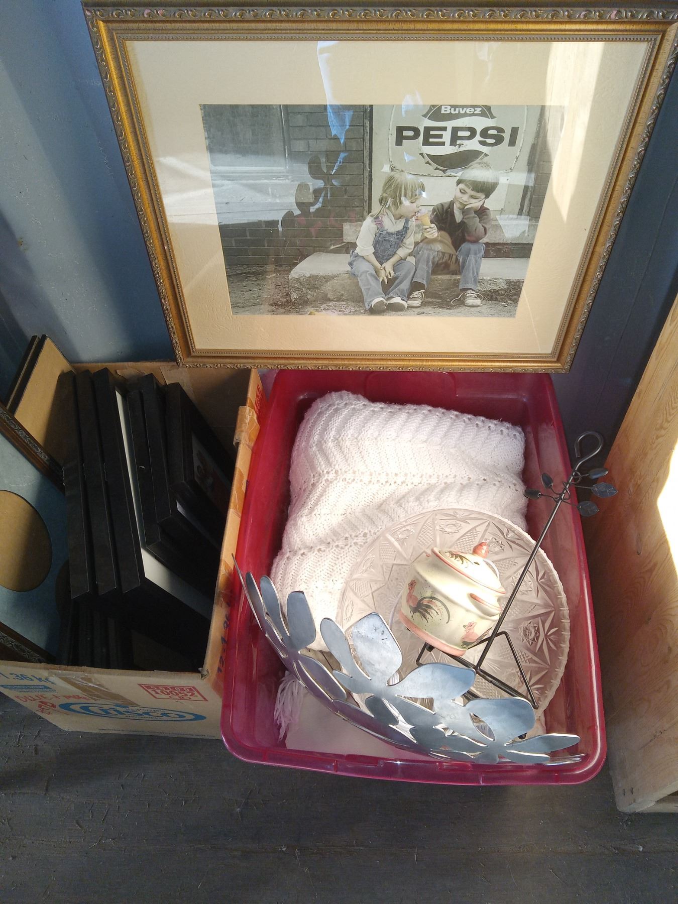 PICTURES, FRAMES, PINK BIN of CONTENTS (WHITE APHGAN).