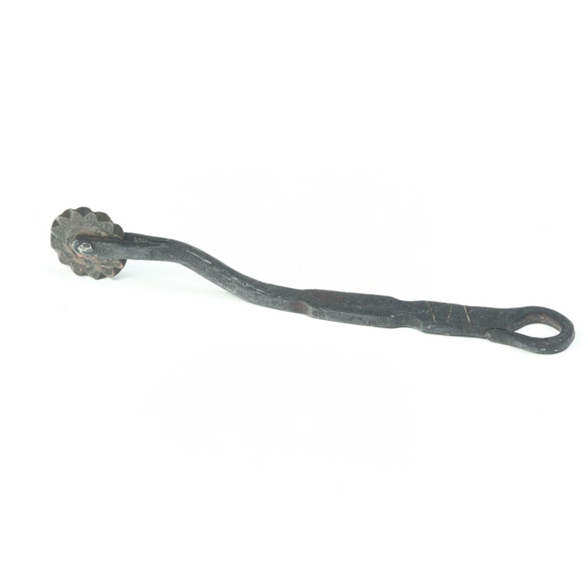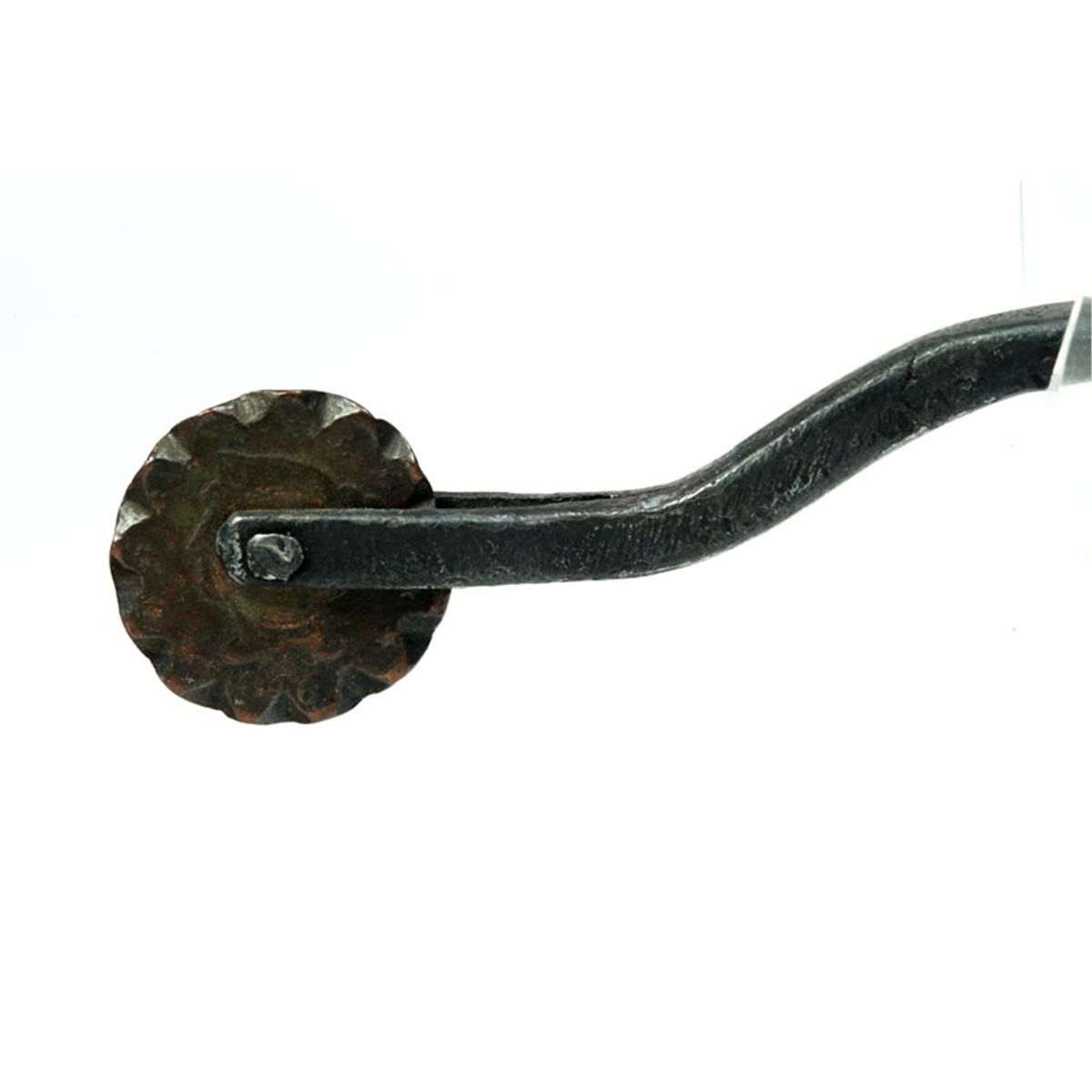 American, mid 19th century, copper and iron. Looped handle and the wheel made from an 1848 coin. 6 1/2"l. Ex Sorber (Pennsylvania), ex David Good (Ohio).
