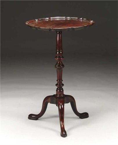 PIE CRUST TOP MAHOGANY QUEEN ANNE CANDLESTAND. Nicely carved pie crust top supported by a turned and carved shaft supported by three snake legs with pad feet. SIZE: 28-1/4” h x 18” dia. CONDITION: Top has butterfly repairs to cracks and edge restoration, old repairs to legs. Otherwise good. 9-27084