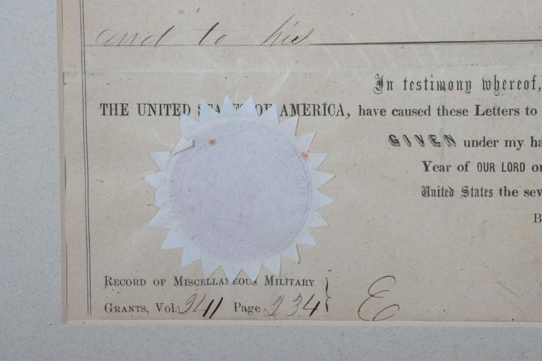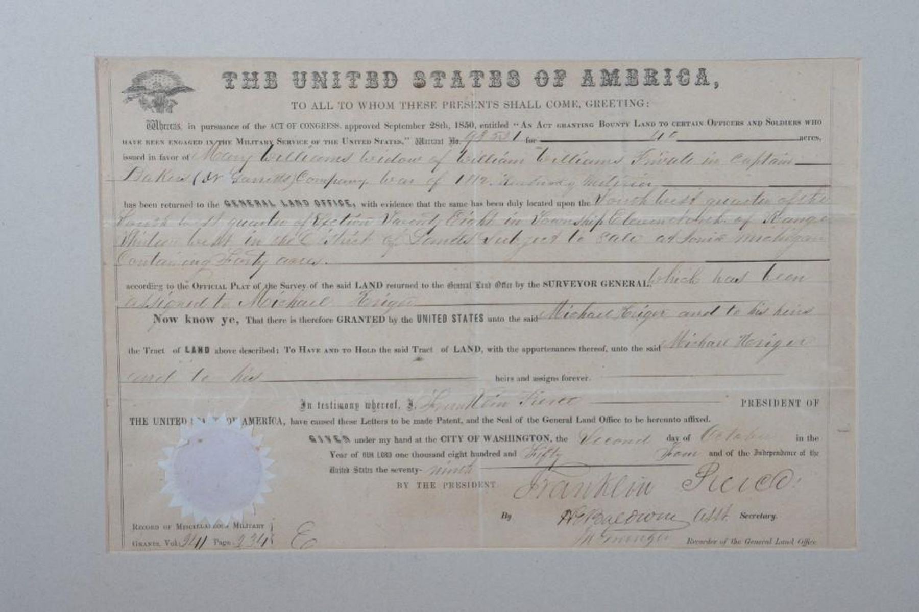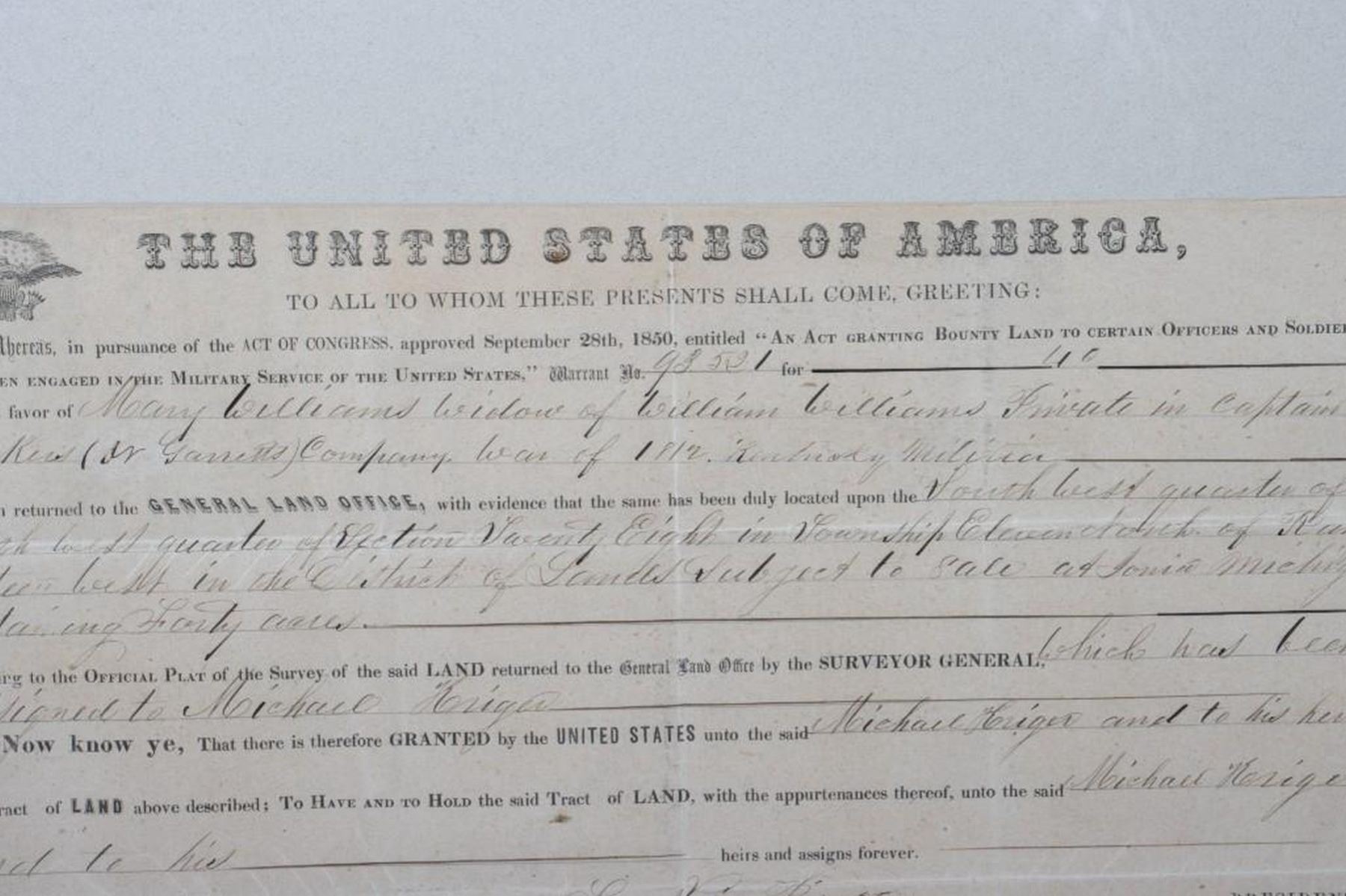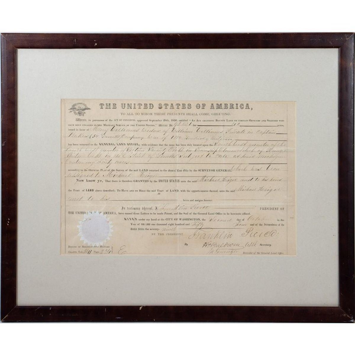 Secretarial signed U.S. Government land grant document issued during the presidency of Franklin Pierce (1804-1896), dated 1854, concerning a grant of 1850 to: "Mary Williams widow of William Williams, a Private in Captain Baker's (or Ganetts) Company. War of 1812. Kentucky Militia," which has been returned to the General Land Office. The document transfers the land grant to Michael Keriger(?) and his heirs. With a secretarial signature for President Franklin Pierce, by the Recorder of the General Land Office. 9 1/2" x 14 3/8" (sight); 17 1/2" x 21 1/2" (frame). PLEASE NOTE: THE DOCUMENT IS TONED/DARKENED WITH AGE; THE IMAGE MAY APPEAR LIGHTER ON DIFFERENT SCREENS. Condition: Good; with fold creases, toning.