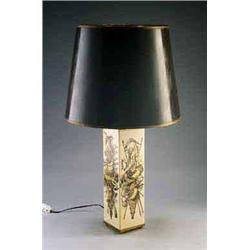 PIERO FORNASETTI, Mailand Tischleuchte, Messing, Metall, cremefarben lackiert, schwarz-goldenes Dekor. Vierseitige Pfeilerform auf Messingstand und mit Messingmontierung. An den Seiten jeweils vertikal angeordnetes Dekor aus den Bereichen Jagd, Fischfang und Wissenschaft. Dunkelbrauner Schirm. Gebrauchsspuren. H. des Lampenfußes: 40 cm. Bez.: Firmenetikett mit Aufschrift FORNASETTI und Zusatz MADE IN ITALY. 1950er Jahre Lit.: Patrick Mauries: Fornasetti. Designer of Dreams. London 1991. Abb. S. 148