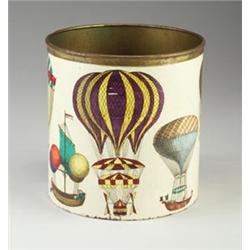 PIERO FORNASETTI metal wastepaper basket, transfer-decorated on enamel with colorful balloon motif. Small chips to base. Circular Fornasetti Milano label. 11" x 10 1/4" $400 - 600
