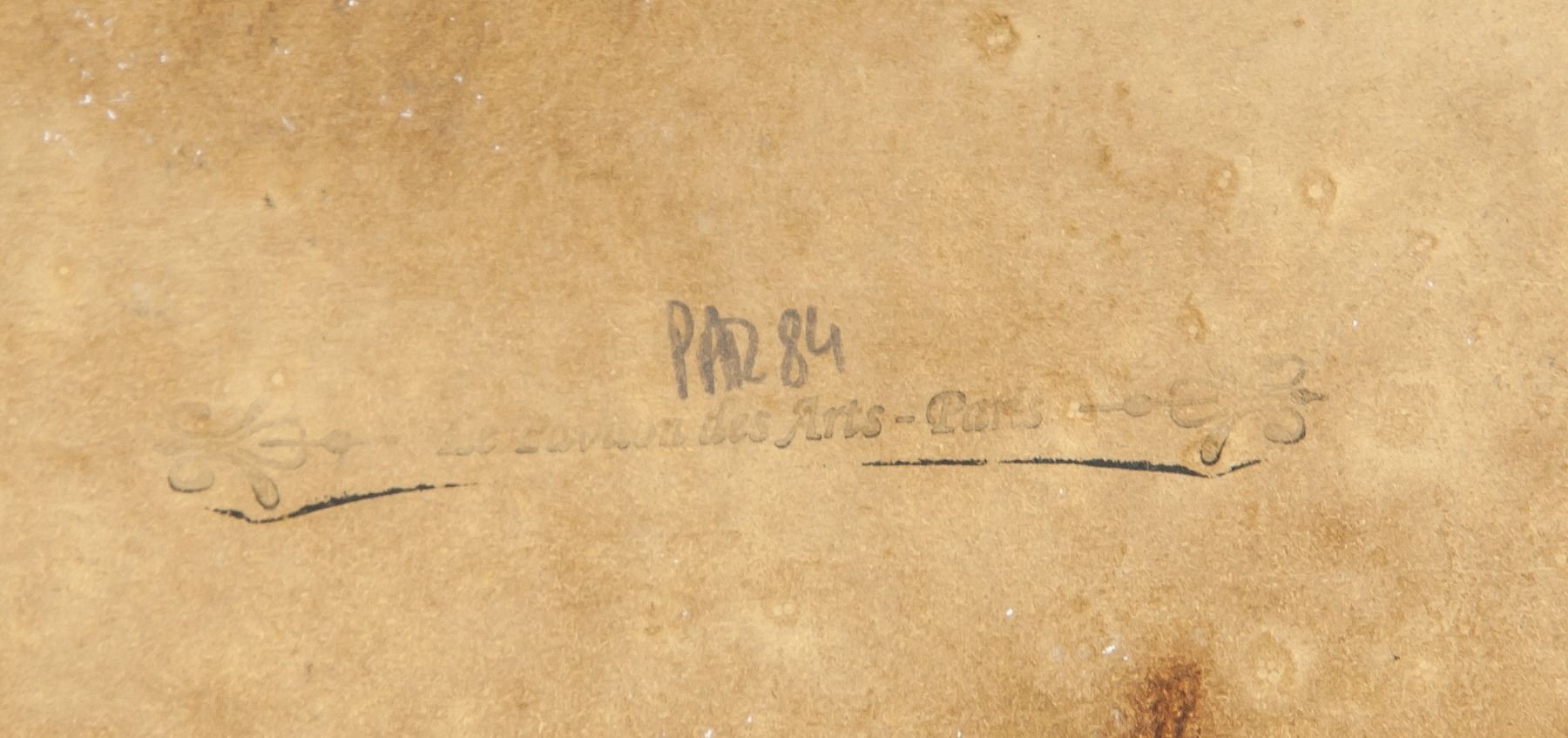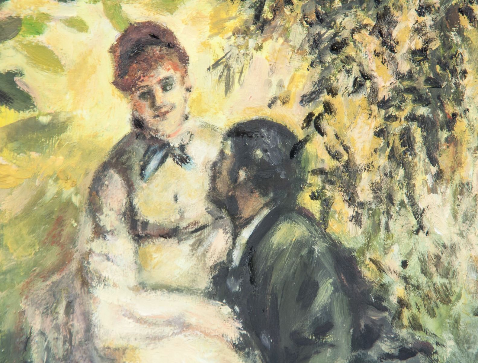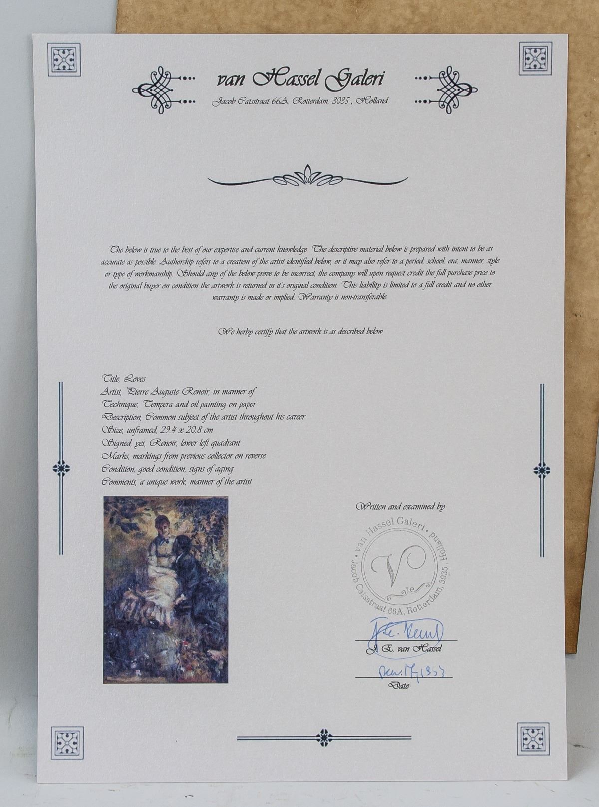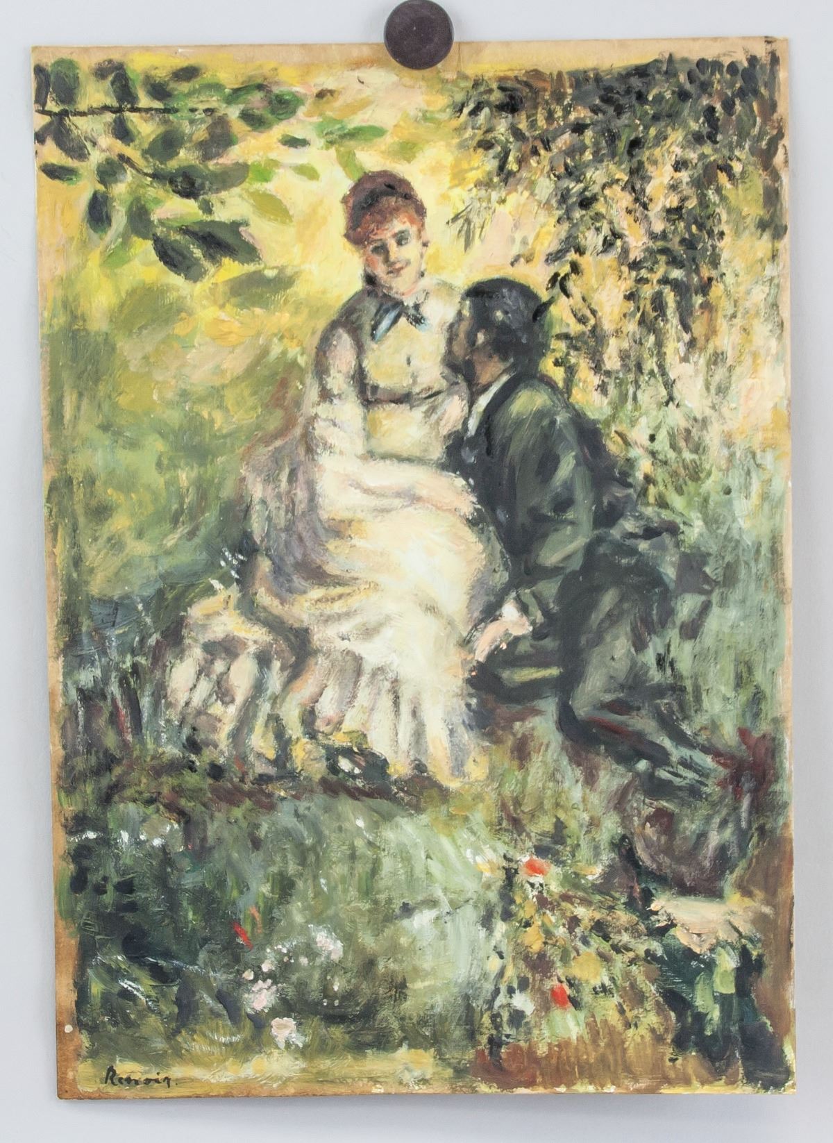 Tempera, oil, and gouache on paper. Featuring portrait of lovers. Signed and attr. Pierre-Auguste Renoir (French, 1841-1919) on the lower left corner. Marked with gallery seal with notation on verso. Accompanied with a certificate of authenticity. 20.8 x 29.4 cm (8.2 x 11.6 inches). Pierre-Auguste Renoir was a French painter and leading figure in the Impressionist movement. Renoir applied pigment with lively brushstrokes that effectively captured flickering light and atmosphere, as seen in his Bal du moulin de la Galette (1876). “For me, a picture must be a pleasant thing, joyous and pretty yes, pretty. There are too many unpleasant things in life for us to fabricate still more,” he once reflected. Born on February 25, 1841 in Limoges, France, Renoir studied at the ecole des Beaux-Arts before meeting Claude Monet and Alfred Sisley. He participated in the first and second Impressionist exhibitions in 1874 and 1876, which despite receiving harsh reviews achieved the goal of providing a challenge to the dominance of the Salon. Over the next decade, Renoir distanced himself from the group, painting more structured compositions, inspired by the Renaissance artworks he saw while on a trip to Italy. Towards the end of his life he suffered from severe rheumatoid arthritis, and was forced to paint many of his last works with a brush tied to his hand. Renoir died on December 3, 1919 in Cagnes-sur-Mer, France. Today, the artist’s works are held in the collections of the Musee d’Orsay in Paris, The Museum of Modern Art in New York, the Hermitage Museum in St. Petersburg, and the National Gallery in London, among others. PROVENANCE: Private estate (Toronto, ON)