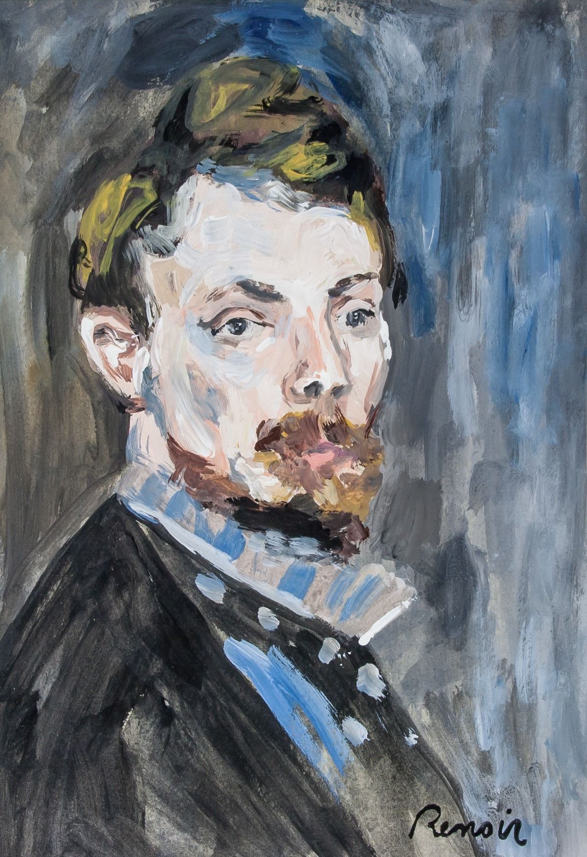 Tempera, oil and gouache on paper. Featuring a self-portrait. Signed and attr. Pierre-August Renoir (French, 1841-1919) on the lower right corner. Marked with gallery seal with notation on verso. Accompanied with a certificate of authenticity. 28.3 x 19.7 cm (11.1 x 7.8 inches). Pierre-Auguste Renoir was a French painter and leading figure in the Impressionist movement. Renoir applied pigment with lively brushstrokes that effectively captured flickering light and atmosphere, as seen in his Bal du moulin de la Galette (1876). “For me, a picture must be a pleasant thing, joyous and pretty yes, pretty. There are too many unpleasant things in life for us to fabricate still more,” he once reflected. Born on February 25, 1841 in Limoges, France, Renoir studied at the ecole des Beaux-Arts before meeting Claude Monet and Alfred Sisley. He participated in the first and second Impressionist exhibitions in 1874 and 1876, which despite receiving harsh reviews achieved the goal of providing a challenge to the dominance of the Salon. Over the next decade, Renoir distanced himself from the group, painting more structured compositions, inspired by the Renaissance artworks he saw while on a trip to Italy. Towards the end of his life he suffered from severe rheumatoid arthritis, and was forced to paint many of his last works with a brush tied to his hand. Renoir died on December 3, 1919 in Cagnes-sur-Mer, France. Today, the artist’s works are held in the collections of the Musee d’Orsay in Paris, The Museum of Modern Art in New York, the Hermitage Museum in St. Petersburg, and the National Gallery in London, among others. PROVENANCE: Private estate (Toronto, ON)