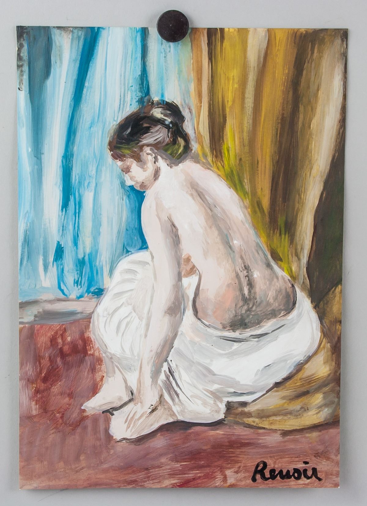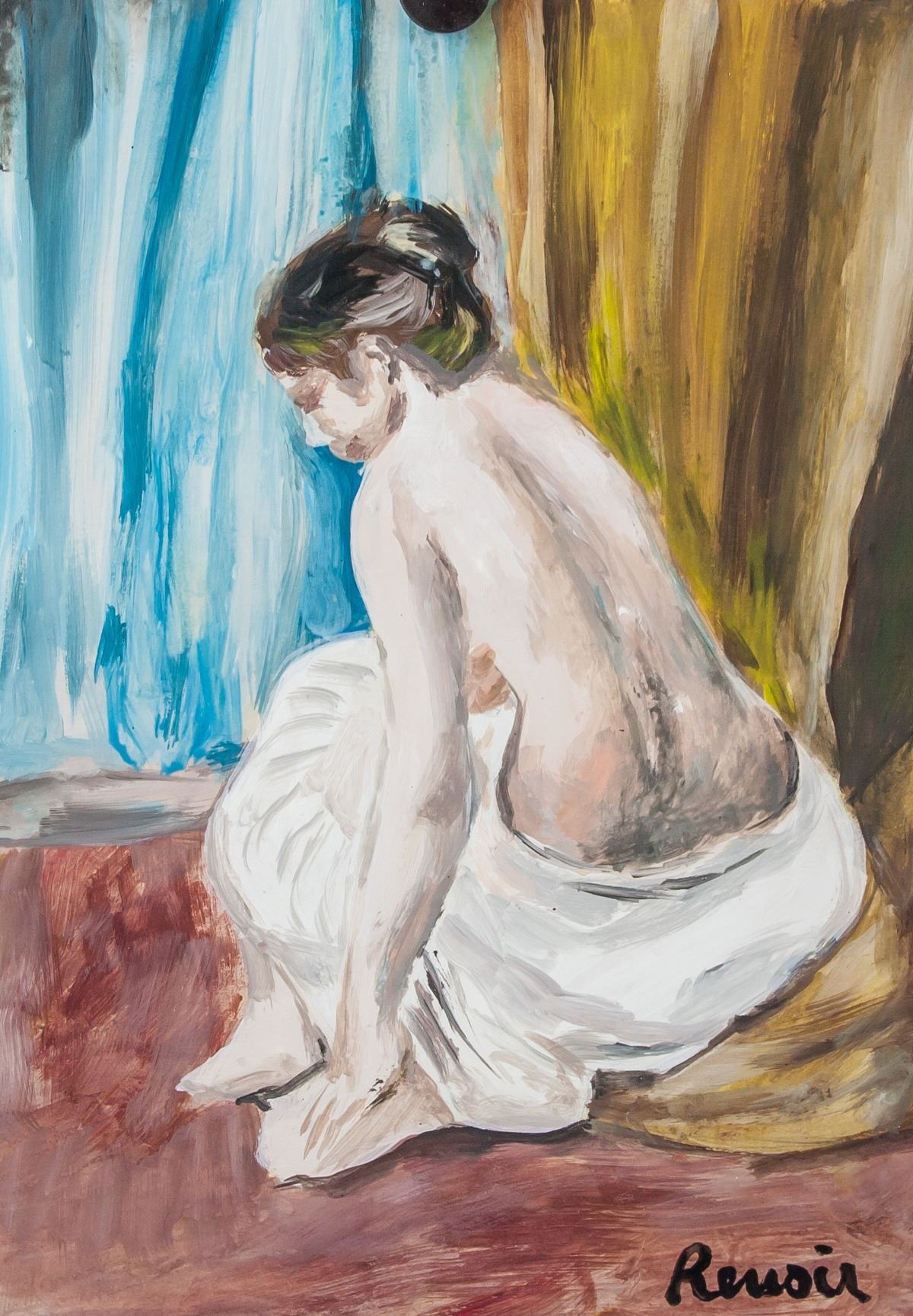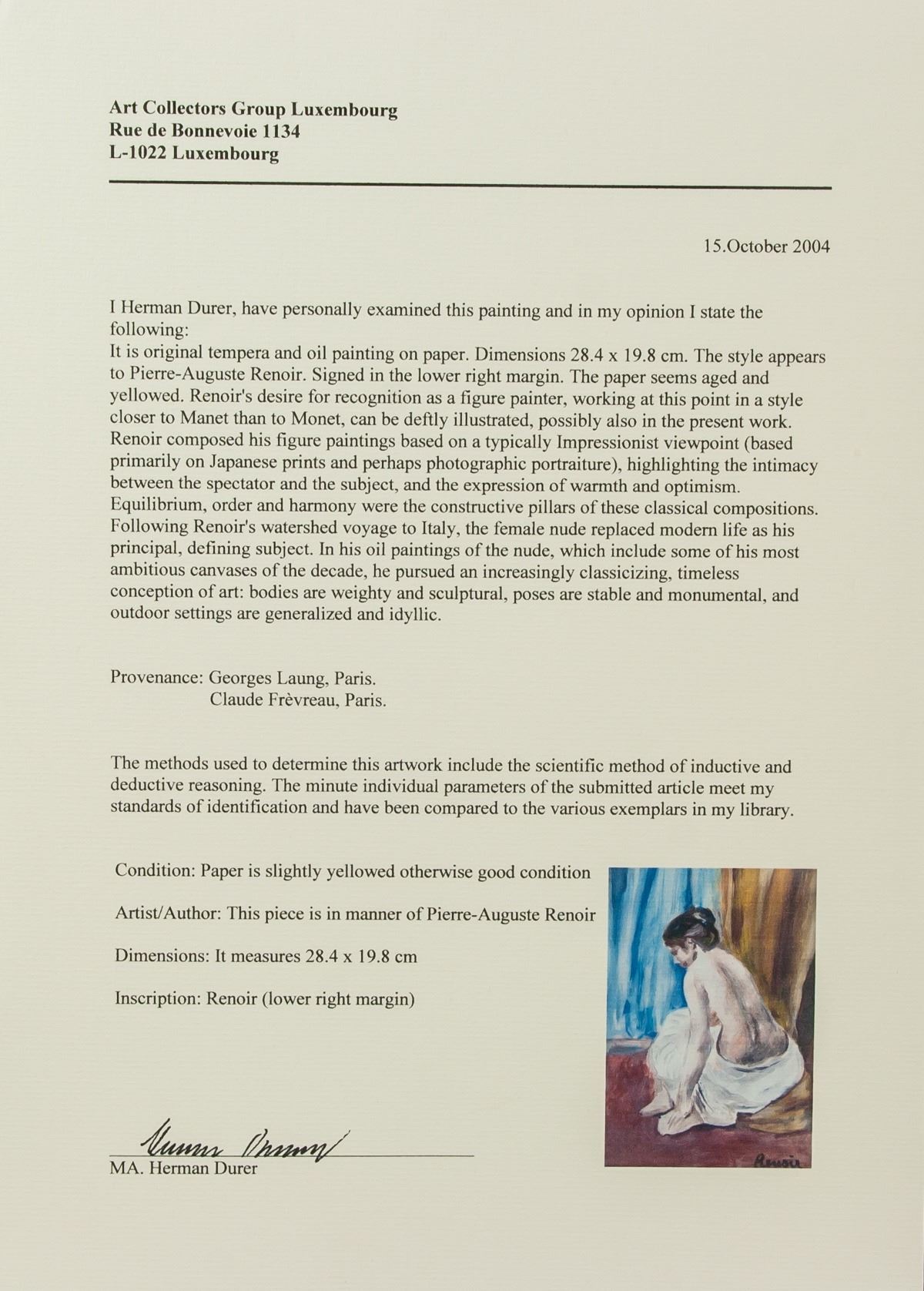 Tempera and oil on paper. Featuring a figure study of a woman, nude. Signed and attr. Pierre-Auguste Renoir (French, 1841-1919) on the lower right corner. Marked on verso with gallery notation. Accompanied with a certificate of authenticity. 28.4 x 19.8 cm (11.2 x 7.8 inches). Pierre-Auguste Renoir was a French painter and leading figure in the Impressionist movement. Renoir applied pigment with lively brushstrokes that effectively captured flickering light and atmosphere, as seen in his Bal du moulin de la Galette (1876). “For me, a picture must be a pleasant thing, joyous and pretty yes, pretty. There are too many unpleasant things in life for us to fabricate still more,” he once reflected. Born on February 25, 1841 in Limoges, France, Renoir studied at the ecole des Beaux-Arts before meeting Claude Monet and Alfred Sisley. He participated in the first and second Impressionist exhibitions in 1874 and 1876, which despite receiving harsh reviews achieved the goal of providing a challenge to the dominance of the Salon. Over the next decade, Renoir distanced himself from the group, painting more structured compositions, inspired by the Renaissance artworks he saw while on a trip to Italy. Towards the end of his life he suffered from severe rheumatoid arthritis, and was forced to paint many of his last works with a brush tied to his hand. Renoir died on December 3, 1919 in Cagnes-sur-Mer, France. Today, the artist’s works are held in the collections of the Musee d’Orsay in Paris, The Museum of Modern Art in New York, the Hermitage Museum in St. Petersburg, and the National Gallery in London, among others. PROVENANCE: Private estate (Toronto, Canada)