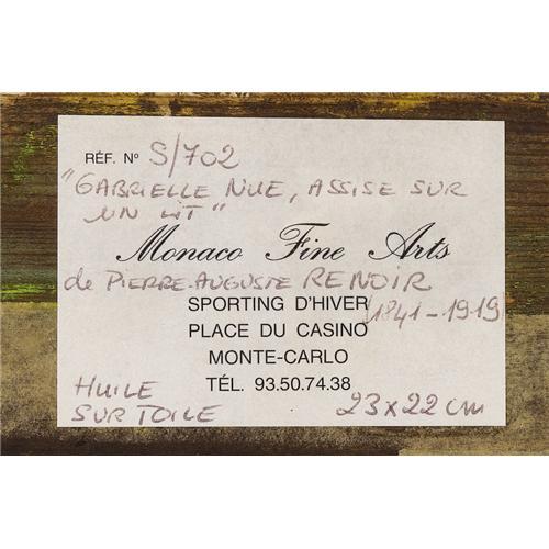 <B>PIERRE-AUGUSTE RENOIR</B></I> (French 1841-1919)<BR><I>Gabrielle Nue, Assise sur un lit (Gabrielle Nude, Sitting on a Bed)</B></I><BR>Oil on linen<BR> 8 x 7-1/2 inches (20.3 x 19.1 cm)<BR>Signed upper left: <I>Renoir</B></I><BR><BR><I>Gabrielle Nue, Assise sur un Lit</B></I> is an intimate study of the nude female form, following in the tradition of Renoir's “Bathers.” The painting offers a subdued palette of neutral tones blending muted greens with natural sand tones. The stylistically strong work is comprised of a simple composition of the lone figure against an abstract background.<BR>This lot has been authenticated by the Wildenstein Institute (2001). <B>Condition Report:</B> relined, surface cleaned - please review images online<BR><BR><b>Shipping:</b> Requires 3rd Party Shipping (<a target="_blank" href="http://www.heritageauctions.com/common/shipping.php">view shipping information</a>)