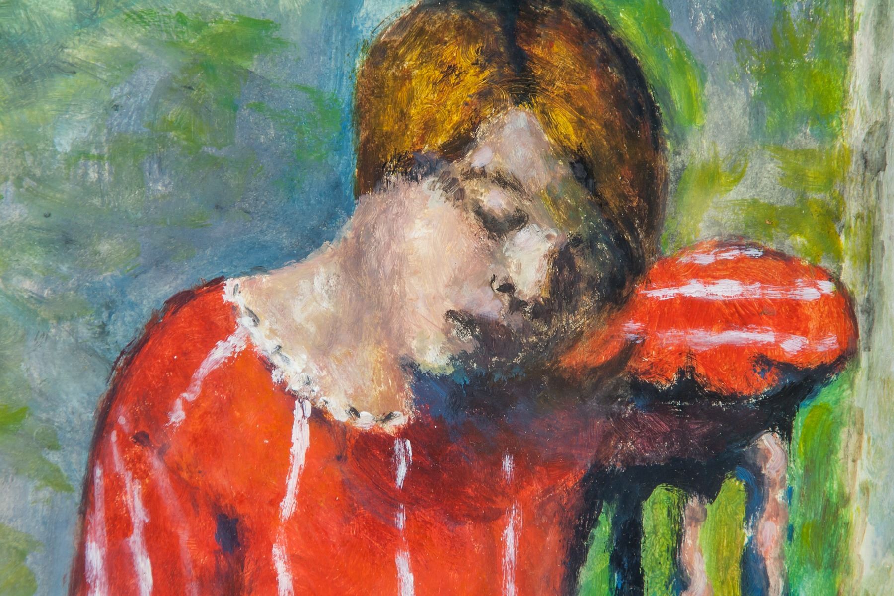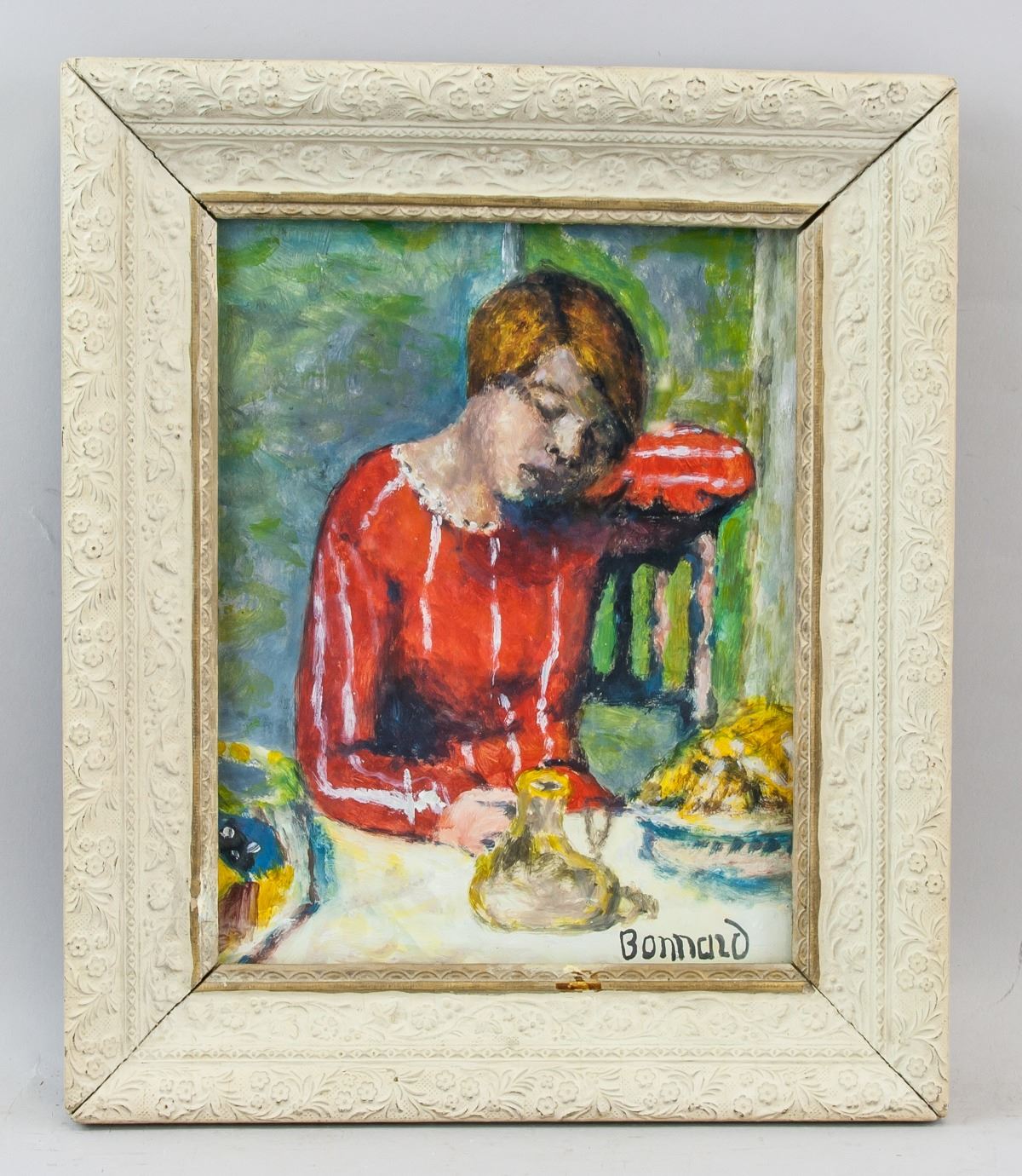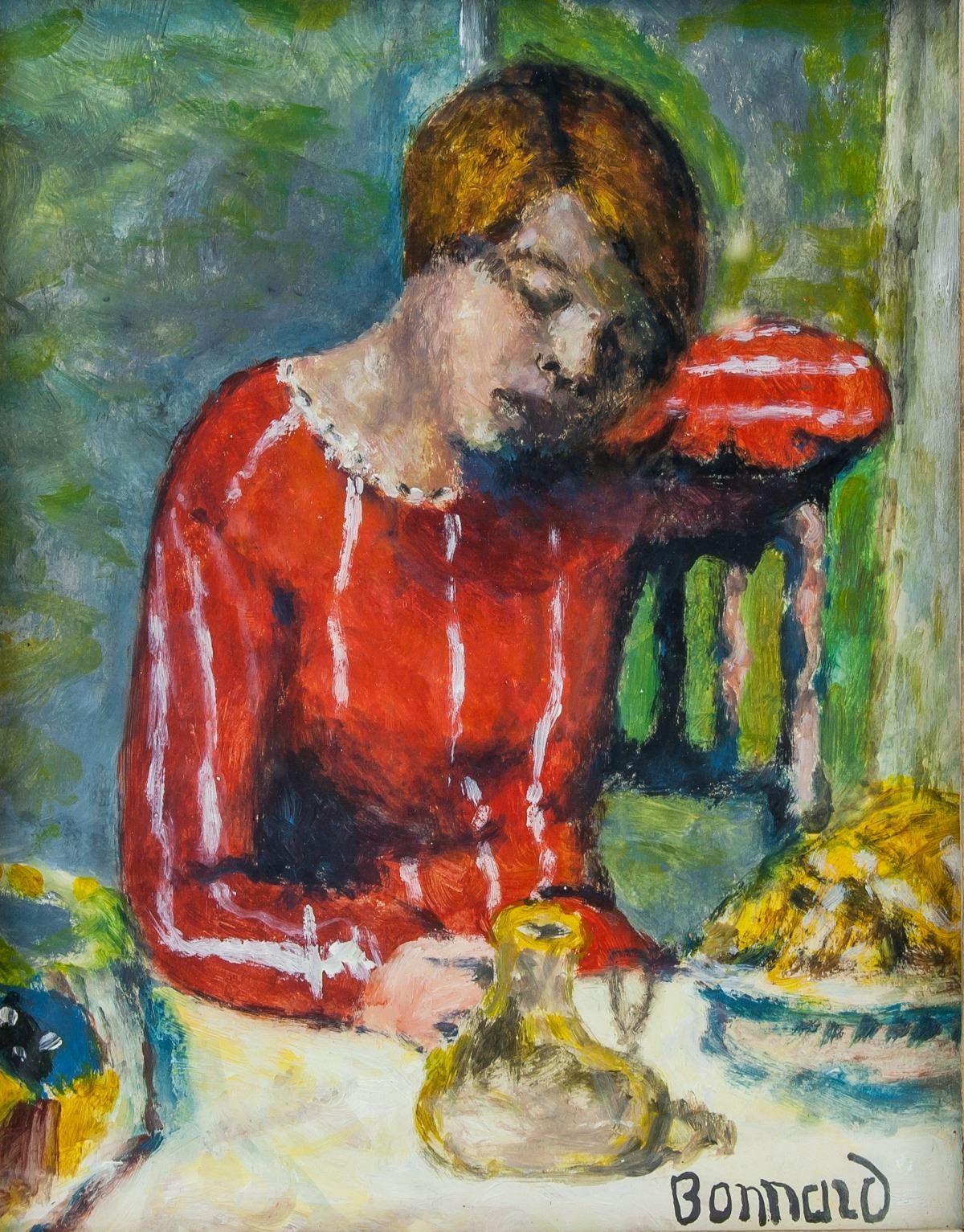 Oil on paper, framed. Featuring a portrait of a girl at a table. Signed and attr. Pierre Bonnard (French, 1867-1947) on the lower right corner. 29 x 23.5 cm (11.4 x 9.3 inches). Pierre Bonnard was a French Post-Impressionist painter remembered for his ability to convey dazzling light with juxtapositions of vibrant color. “What I am after is the first impression—I want to show all one sees on first entering the room—what my eye takes in at first glance,” he said of his work. Born on October 3, 1867 in Fontenay-aux-Roses, France, Bonnard studied law at the Sorbonne, graduating in 1888. During this time, he was also enrolled at the École des Beaux-Arts but left to attend the Académie Julian in 1889. At this more open-minded painting academy, Bonnard met Maurice Denis, Paul Sérusier, and Édouard Vuillard, among others. Together with these artists he helped from a group known as the Nabis, who were influenced by Japanese prints and the use of flat areas of color. Early on in his career, Bonnard was better known for his prints and posters than for his paintings. Moving to the South of France in 1910, over the following decades, Bonnard receded from the forefront of the art world, mainly producing tapestry-like paintings of his wife Marthe in their home. Late works of Bonnard, such as The Terrace at Vernonnet (1939), more closely resembled a continuation of Impressionism than other avant-garde styles of the era. Because of this, at the time of his death on January 23, 1947 in Le Cannet, France, the artist’s work had been largely discounted as regressive. Today, his works are held in the collections of the Hermitage Museum in St. Petersburg, the Metropolitan Museum of Art in New York, the Neue Pinakothek in Munich, the Musée d’Orsay in Paris, and the Tate Gallery in London, among others. PROVENANCE: Southern Ontario estate