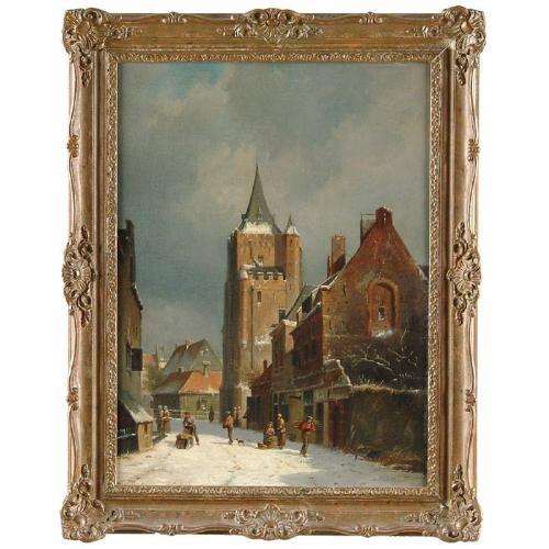 PIETER CORNELIS DOMMERSEN (Dutch, 1834-1908) ""AMSTERDAM-WINTER"". Large oil on wood panel city street scene in the winter shows a snow covered street with eleven figures showing a man with push sleigh, man with bundle of sticks, women with baskets and man walking with dog beside. Sunlight cascades on sides of buildings under gray cloudy skies with blue breaks. Signed lower right ""P.C. D. 73in.. Housed in a fine gesso decorated frame. On back of board with a registry F. R. tag indicating artist, title, size and registered number 15956. Also a Findlay Galleries Chicago label. Also a very early owner tag which appears to read ""O. J. Morgan Esq. No. 280in.. Also a mahogany panel label of ""Geo. Rowney & Co. London"". The artist was known for his realistic street scenes of European cities. SIZE: 24in. x 18in.. CONDITION: Very good. 9-26118
