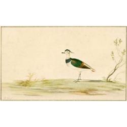 Kiebitz. Aquarell und Tuschfeder. - <U>Monogrammiert</U>. Auf kräftigem chamoisfarbenen Bütten. Größe: 9,9 x 16,5 cm. Schwach stockfleckig. Auf der Unterlage nicht identifizierter Sammlervermerk “gekocht te Amst. Dec’92 Jwd.” in brauner Feder.