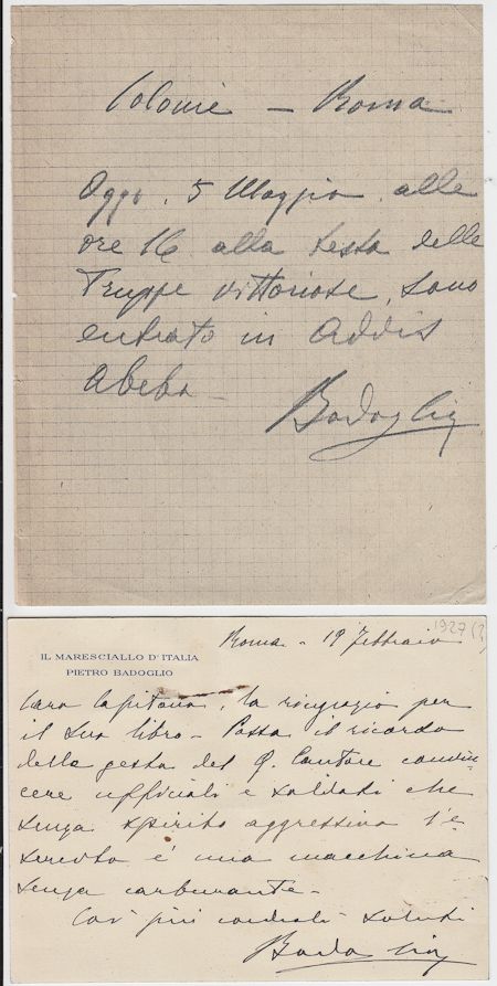 (1871 - 1956) Italian soldier and politician, a member of the Fascist Party and commander of Italian troops under Mussolini in the Second Italo-Abyssinian War. When Mussolini was removed on 24 July 1943, Badoglio was named Prime Minister and eventually signed an armistice with the Allies. Lot of two signed items, each 1p. 12mo., one in pencil, one from Rome and on his marshal's letterhead, both undated, in Italian. Untranslated, with transmittal envelope.
