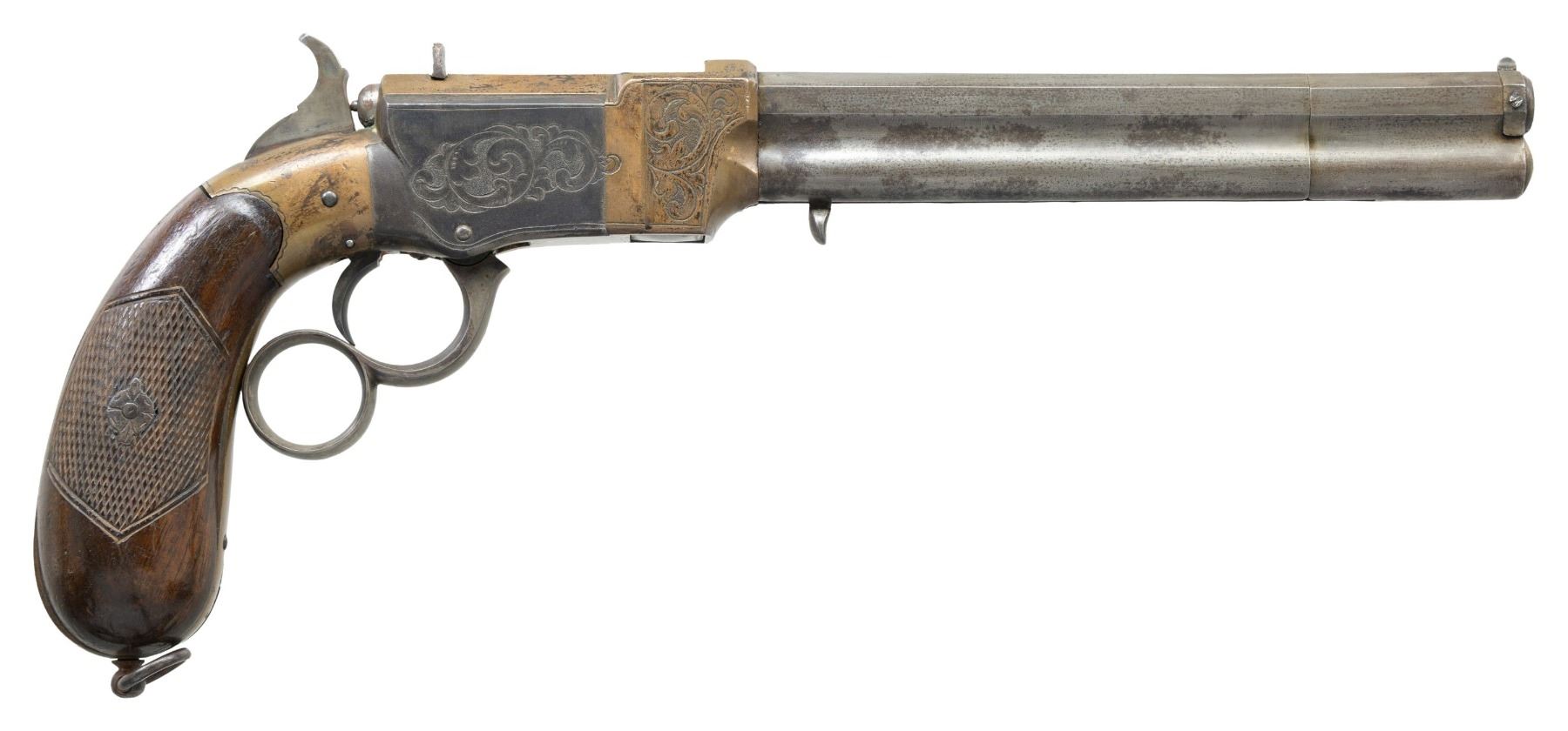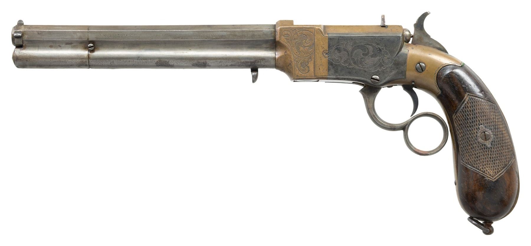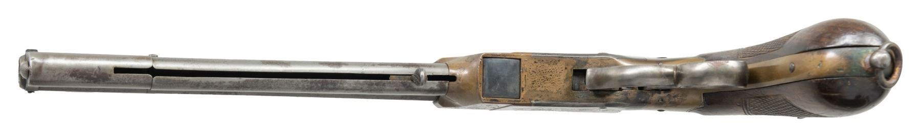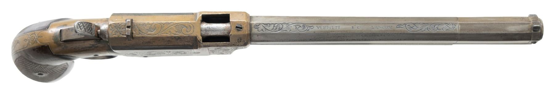 REPEATING PISTOL. Cal. 9mm. NSN. Pietro Venditti patented this close facsimile of the American Volcanic pistol in Italy in 1872. He made his own rocket ball ammunition for his 1st model but soon updated to 2nd model metallic cartridge pistol. Standard configuration with 6.75" octagonal browned barrel engraved on the top-flat with floral scrolls and "VENDITTI E Ct LANGUSI", integral 10-shot magazine below the barrel, same Volcanic style muzzle rotating loading sleeve, brass frame with iron side plates, florally engraved, finger-ring lever forming the trigger guard, checkered burl walnut bag-shaped grips with lanyard ring at butt. CONDITION: good to very good overall, barrel is cleaned to mottled gray patina with freshened engraving, missing magazine spring. Mechanics need attention, will not hold on full cock, clear thin rifled bore. (01-26634/JS). ANTIQUE. $2,000-4,000.