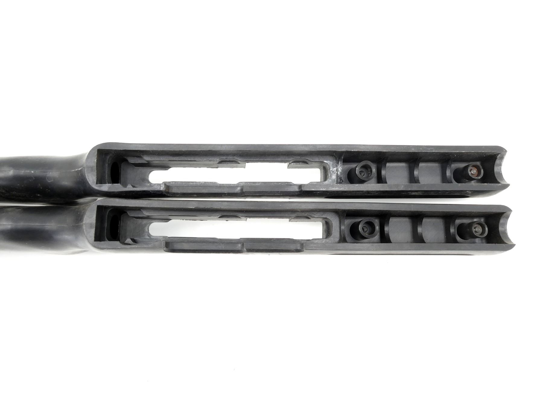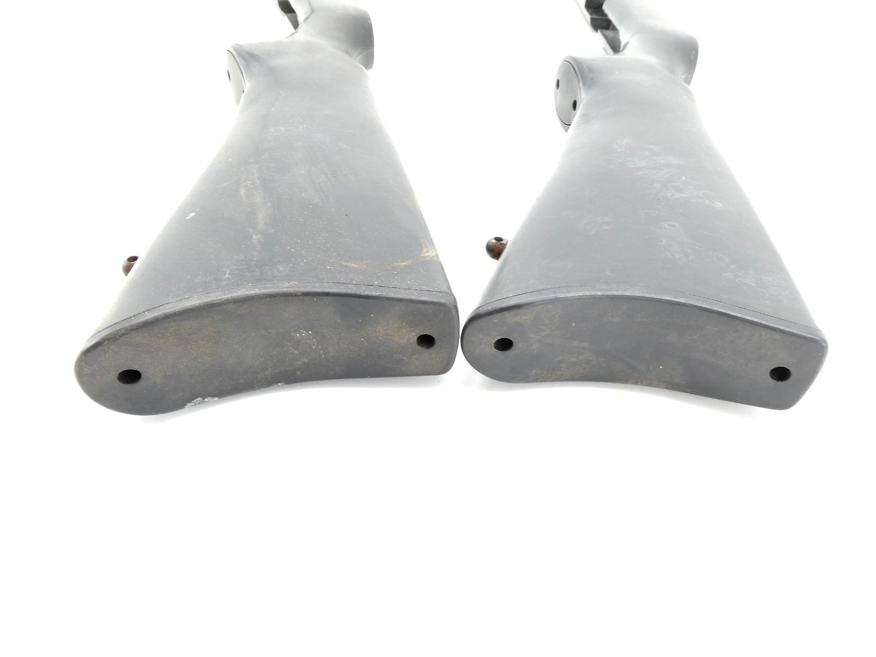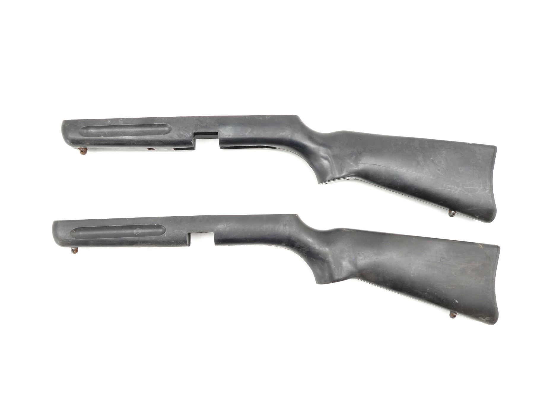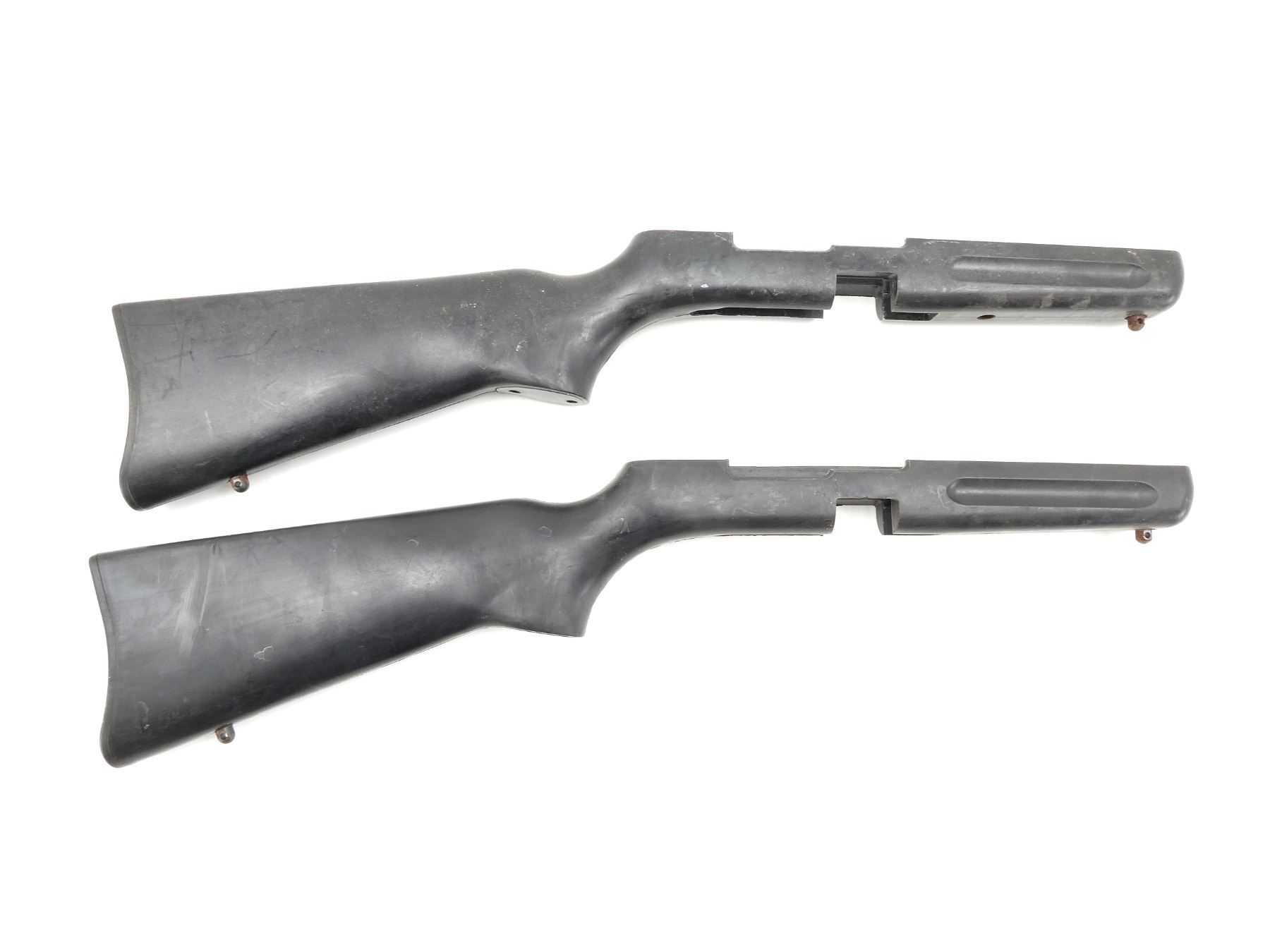 LOT INCLUDES; (2) BLACK SYNTHETIC RIFLE STOCKS, WITH GRIP CAP, BUTT PLATE & SWIVEL STUDS, RUST ON METAL FITTINGS, OAL APPROX. 24". MAY REQUIRE FITTING. SEE PHOTOS.