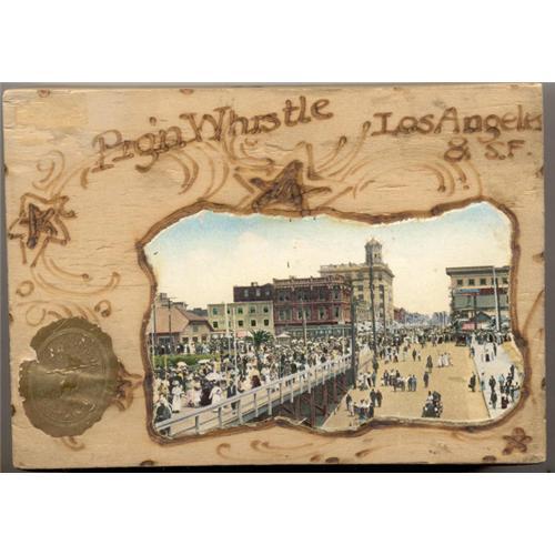 PIG?N WHISTLE STORE GIFT BOX -- c1910, 1½? x 5? x 7?, LA & SF, wood burned design with picture of people and street scene
